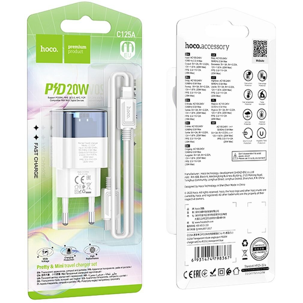 Сетевое зарядное устройство Hoco C125A, Type-C, 20 Вт, прозрачное, Type-C - Lightning,чёрный