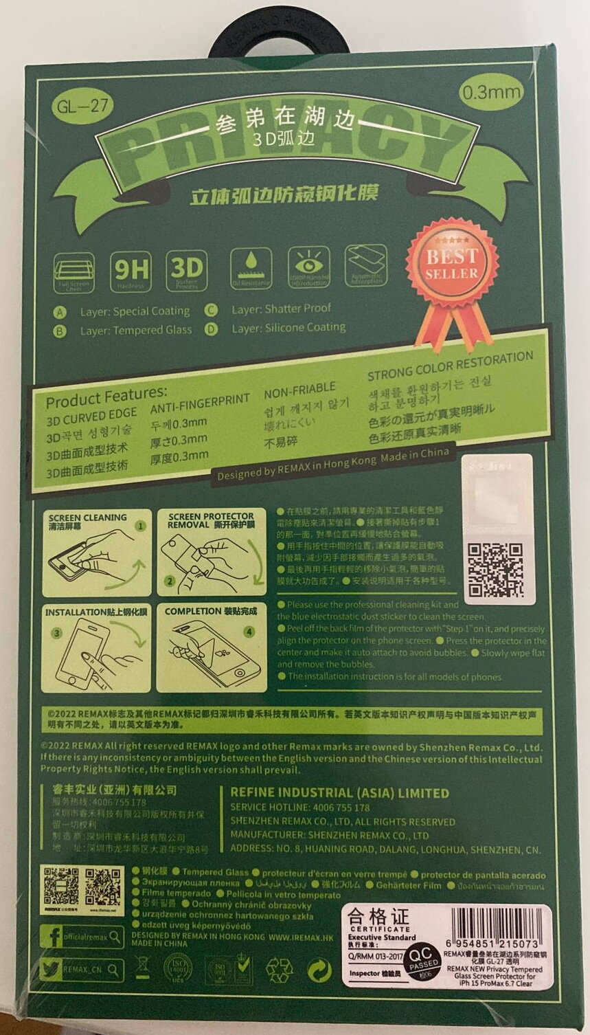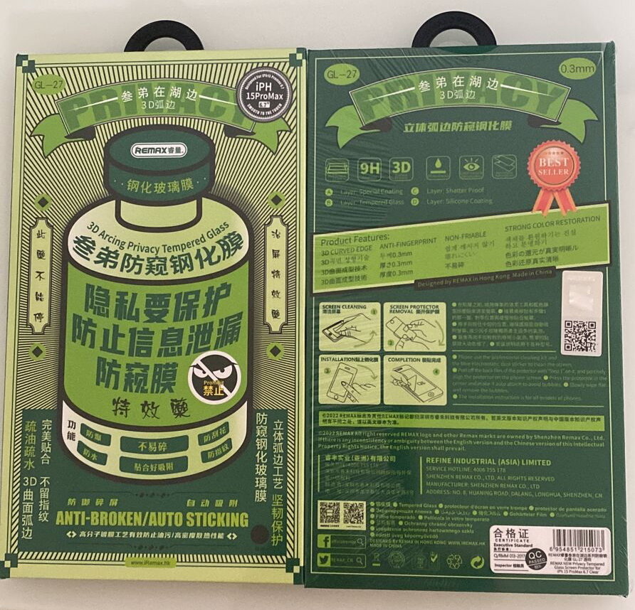 Защитное стекло антишпион REMAX GL-27 для iPhone 15 Pro Max 6,7", 3D, 9H, 0.3mm интересное: