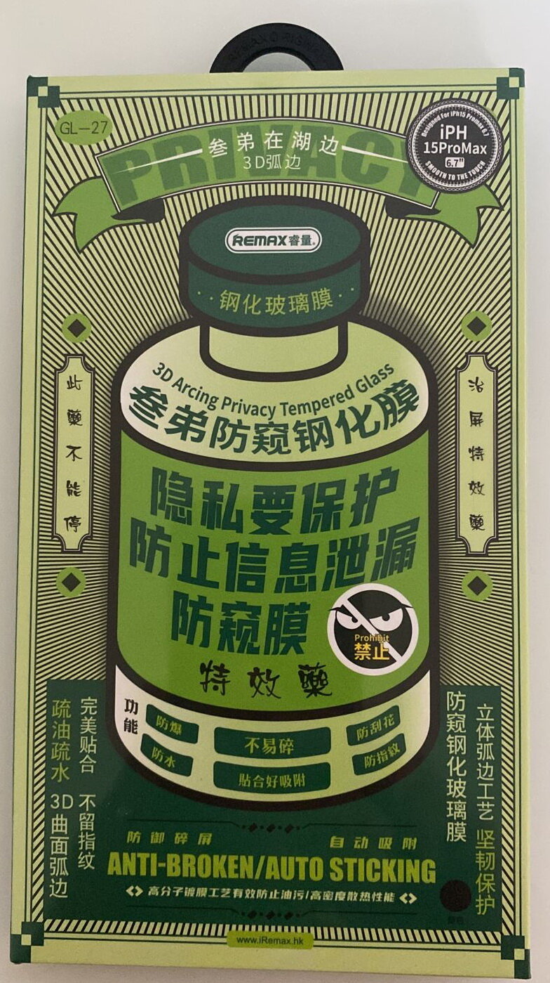 Ниже Вы можете прочитать отзывы на Защитное стекло антишпион REMAX GL-27 для iPhone 15 Pro Max 6,7", 3D, 9H, 0.3mm, ознакомится с подробными характеристиками, посмотреть интересные обзоры и фотографии на Защитное стекло антишпион REMAX GL-27 для iPhone 15 Pro Max 6,7", 3D, 9H, 0.3mm.