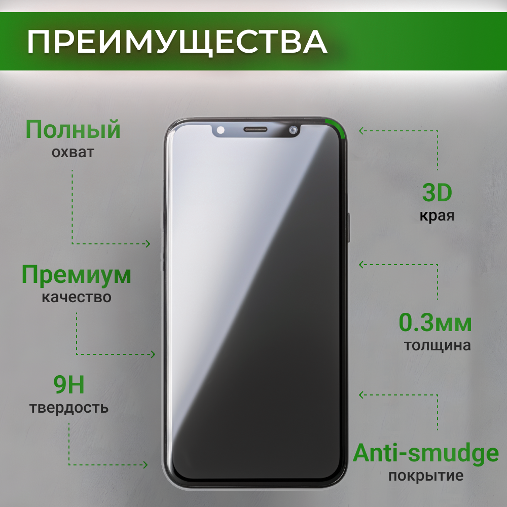 | Особенности | антибликовый эффект / антишпион / глянцевая поверхность / зеркальная поверхность / клей на всей поверхности / олеофобное покрытие / под чехол / полное покрытие экрана / прозрачность / с рамкой |