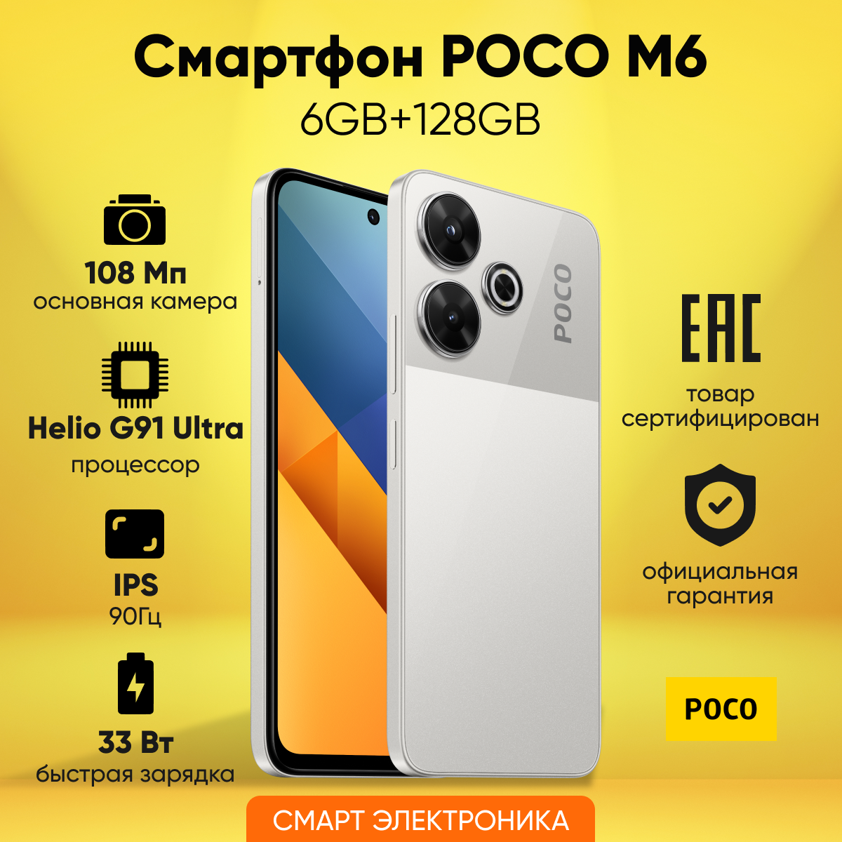 Смартфон Xiaomi POCO M6 6/128 ГБ RU, Dual nano SIM,Серебристый