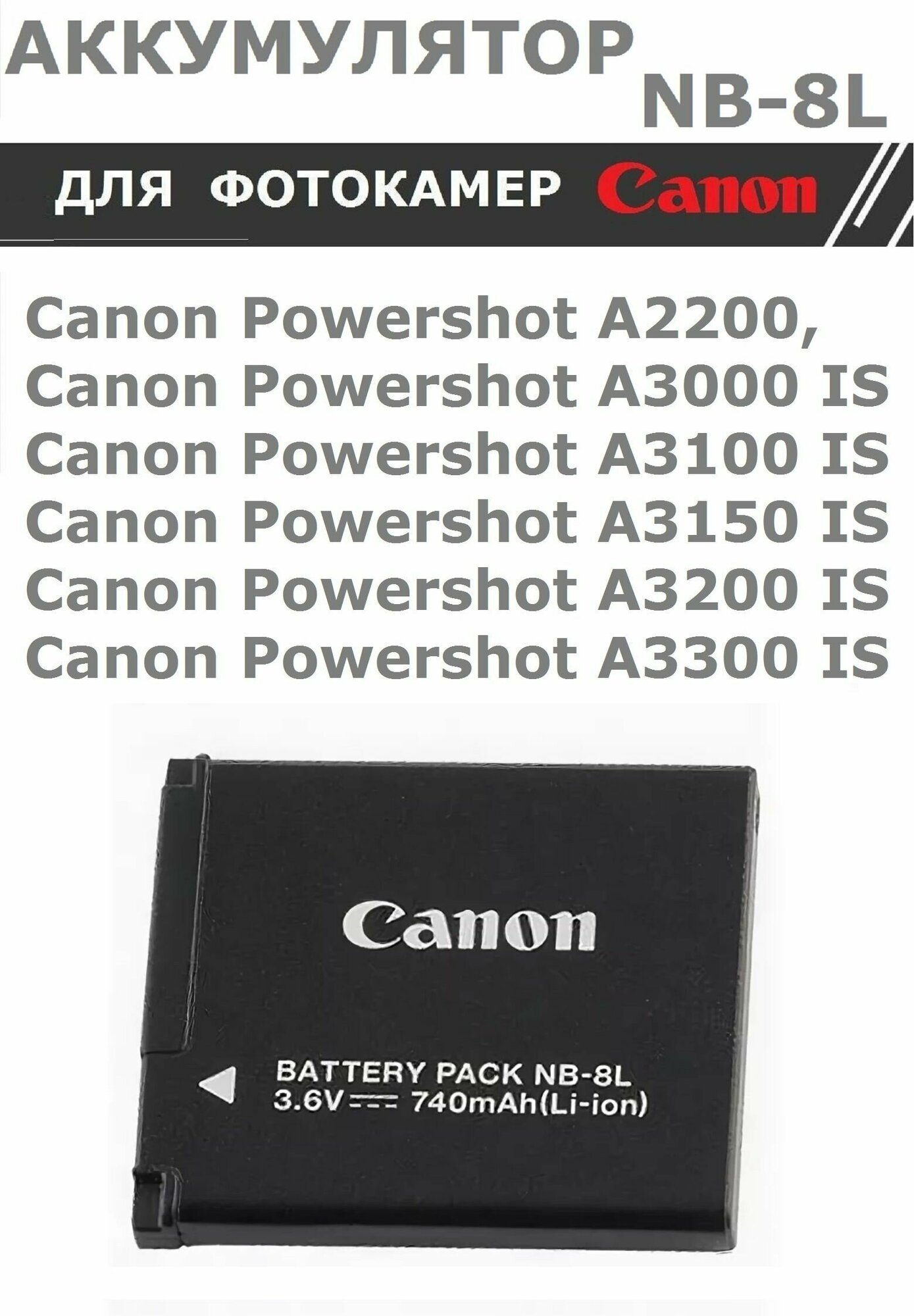 | Совместимость | Canon PowerShot A2200, Canon PowerShot A3000 IS, Canon PowerShot A3100 IS, Canon PowerShot A3200 IS, Canon PowerShot A3300 IS |