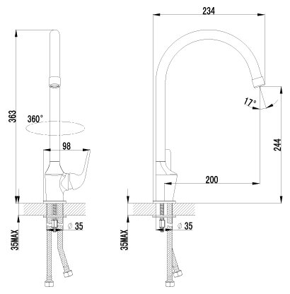 Смеситель для кухни с высоким поворотным изливом 363 мм, хром