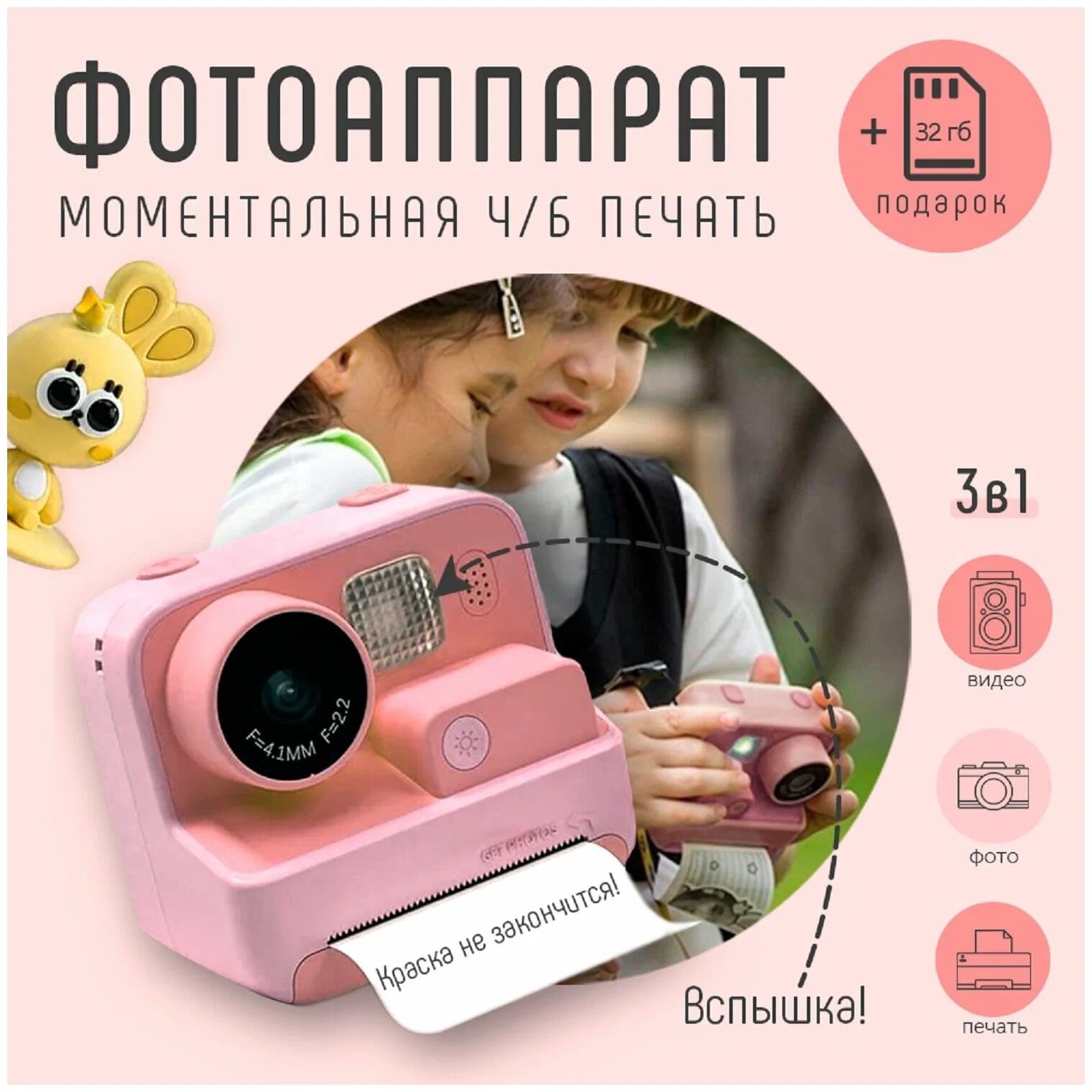 Купить Детский фотоаппарат / Цифровая камера с мгновенной печатью для детей / Детский Polaroid, уличная камера (розовый для девочек)