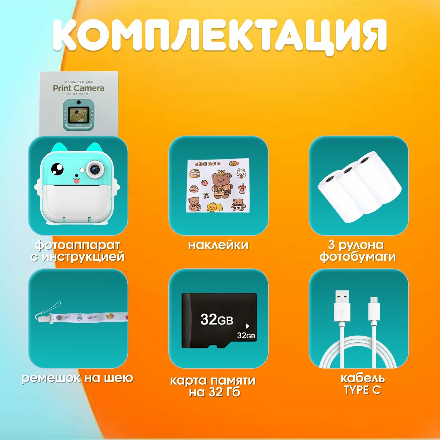 | Комплектация | 1. Детский фотоаппарат с мгновенной печатью, розовый зайчик (1 шт.) 2. Карта памяти 32 Гб (1 шт.) 3. Ремешок для детского фотоаппарата (1 шт.) 4. Термобумага (2 шт.) + 1 шт. в фотоаппарате 5. Силиконовая насадка (1 шт.) 6. Набор наклеек (1 шт.) 7. Инструкция (1 шт.) 8. Провод USB для зарядки (1 шт.) |