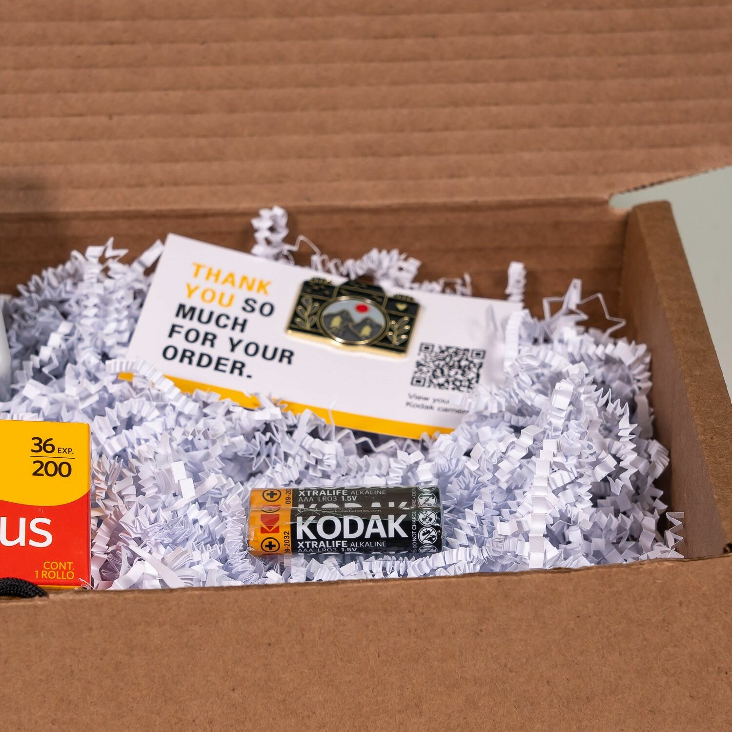 | Комплектация | Подарочный набор включает: – Фотоаппарат Kodak M35 – Фотопленка Kodak ColorPlus 200 на 36 кадров – Ремешок на руку – 2 батарейки Kodak AAA (1 для вспышки, 1 запасная) – Красивый значок пин – Крафт коробка с подарочным наполнителем |