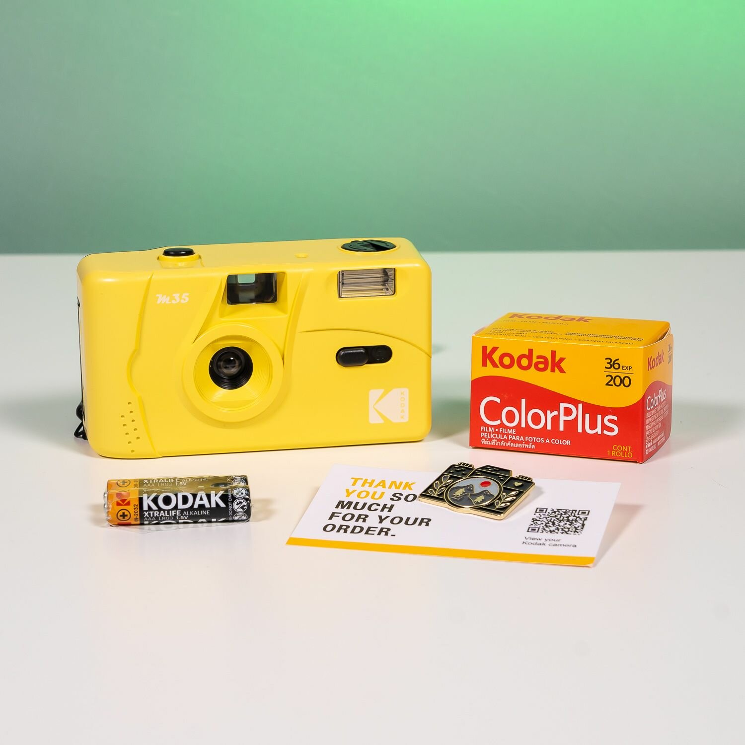 | Комплектация | Подарочный набор включает: – Фотоаппарат Kodak M35 – Фотопленка Kodak ColorPlus 200 на 36 кадров – Ремешок на руку – 2 батарейки Kodak AAA (1 для вспышки, 1 запасная) – Красивый значок пин – Крафт коробка с подарочным наполнителем |