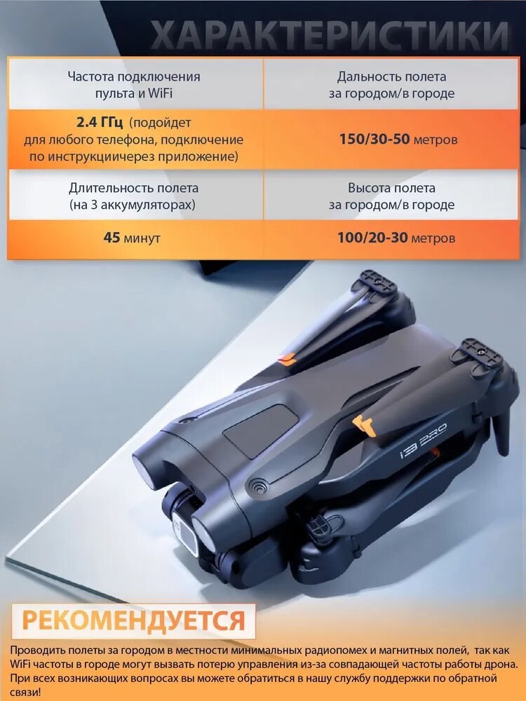 Квадрокоптер I3 PRO WiFi 2.4G, FPV mini с 2 камерами 4K HD, 3 АКБ, защита от столкновений, управление с телефона, запасные лопасти, радиоуправляемый дрон