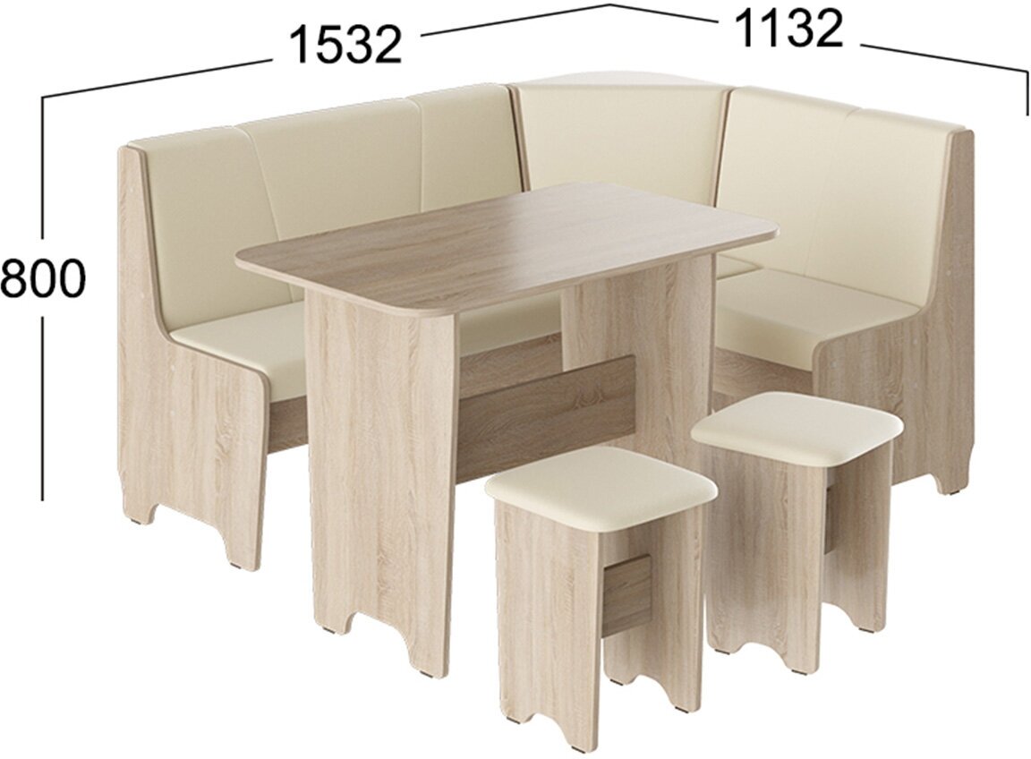 | Габариты | Размеры дивана (ДхШхВ) 153х113х80 см.; Размеры стола (Ш×Г×В): 100×60×73 см.; Размеры табуретов (Ш×Г×В): 33×33×43 см. |