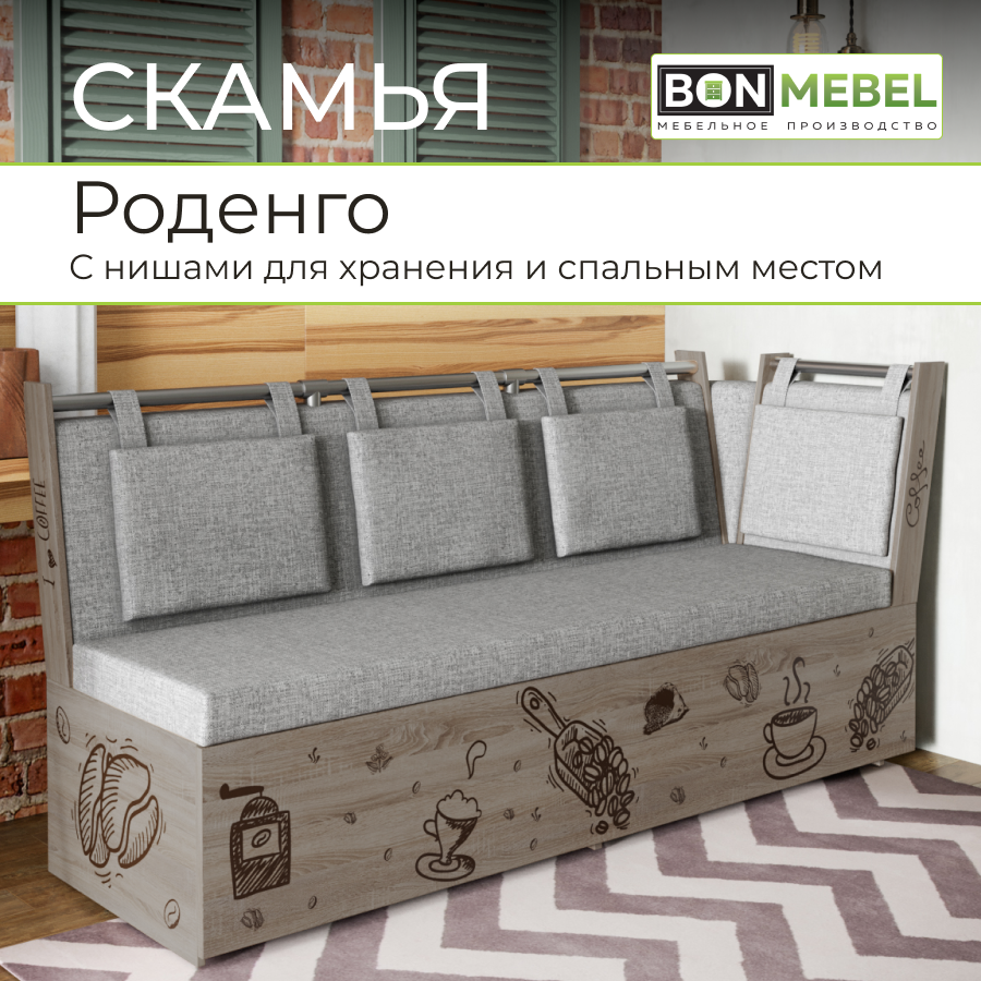 Скамья прямая BONMEBEL со спальным местом Роденго Дуб сонома/Рогожка серый