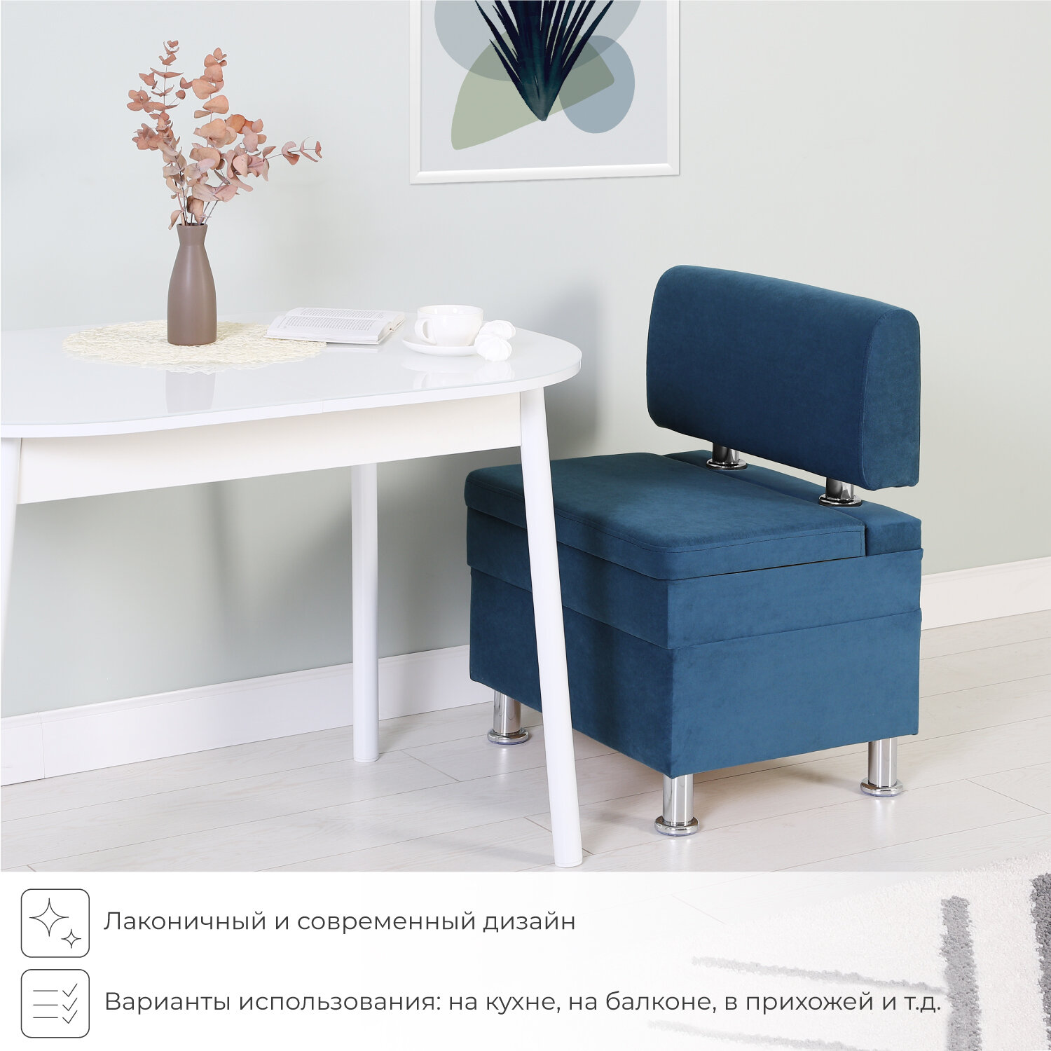 Диван на кухню, прямой, на балкон, в прихожую норта Hippo 1200х490х770 c ящиком для хранения, синий