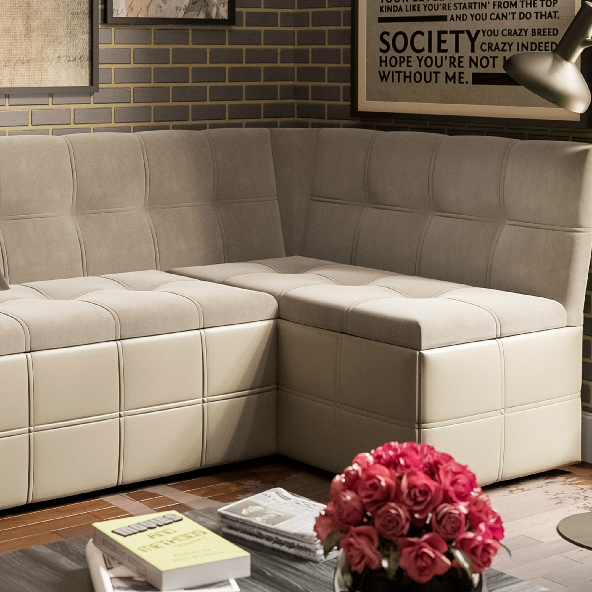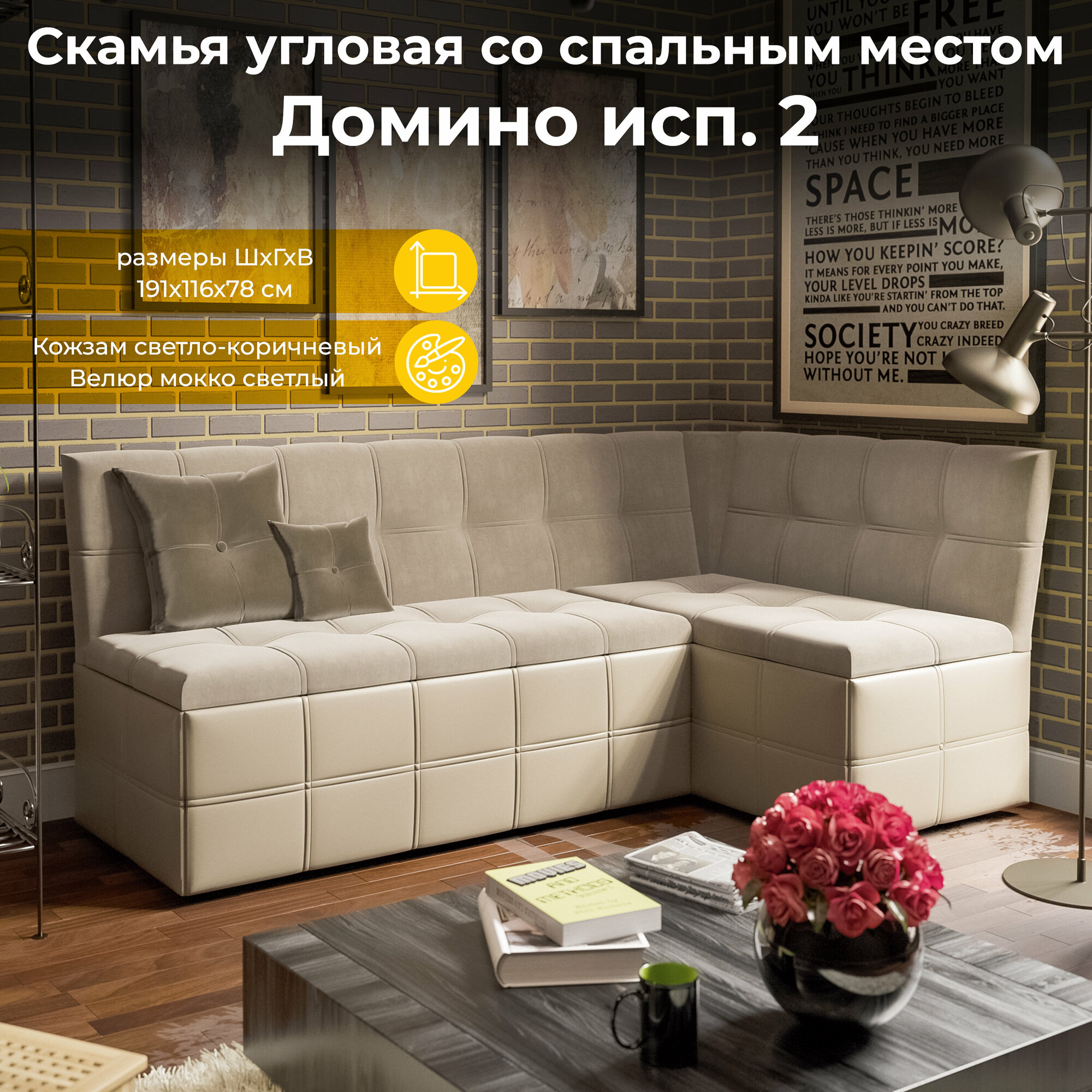 Скамья угловая Трия Домино со спальным местом исп. 2 Кожзам светло-коричневый/Велюр мокко светлый