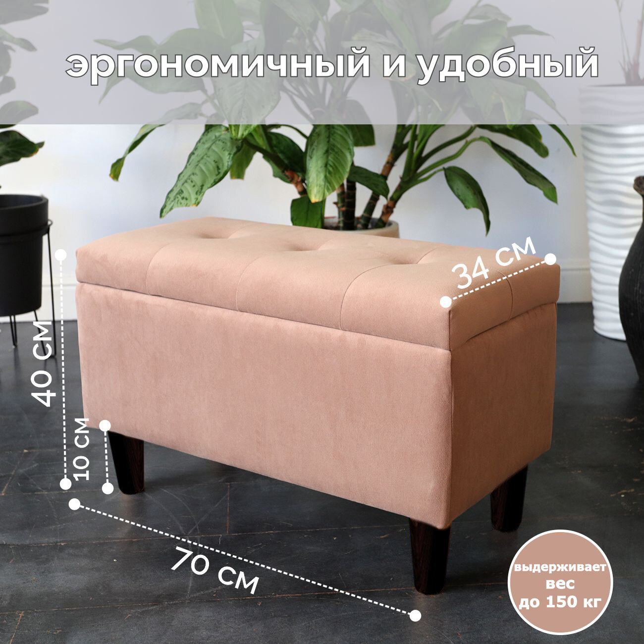 Пуфик-банкетка с ящиком хранения, 70х40х34 см, бежевый, ЛДСП, велюр, MisSofa