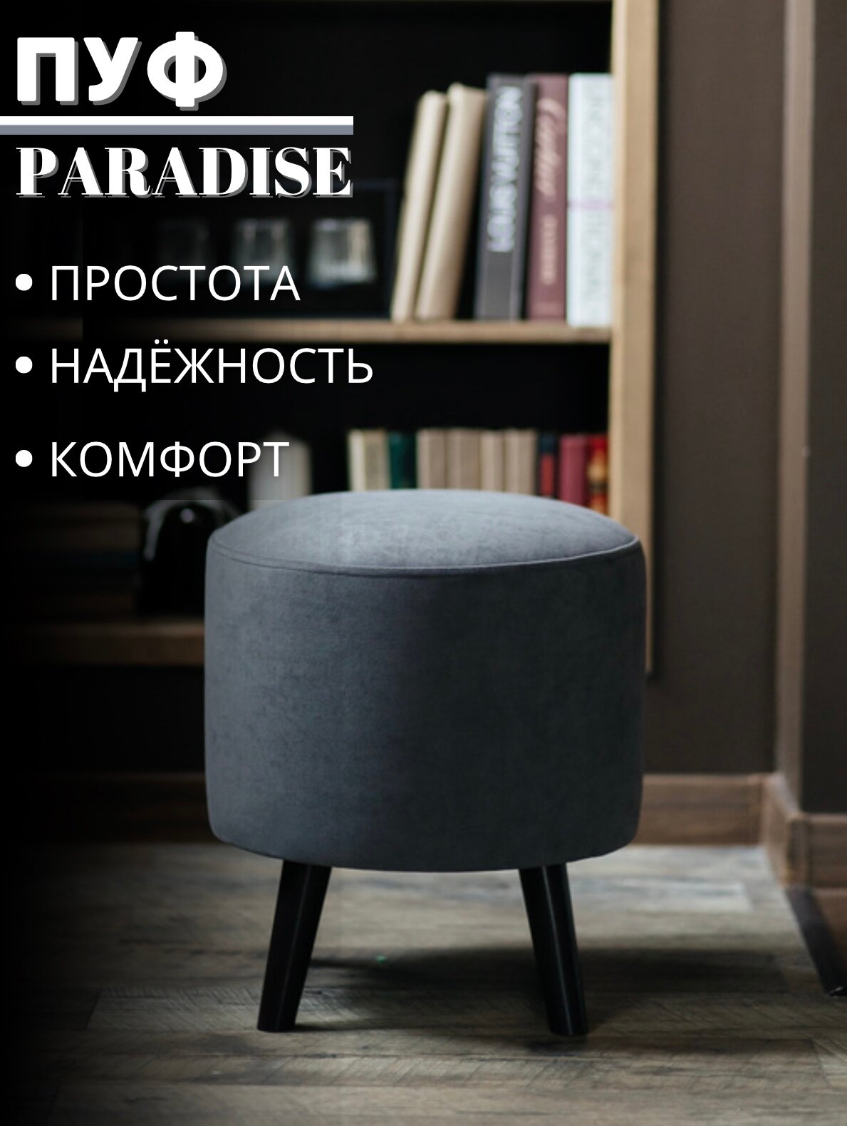 СохранитьПуф Paradise серый-чёрный, круглый, на деревянных ножках, в спальню и в прихожую интересное: