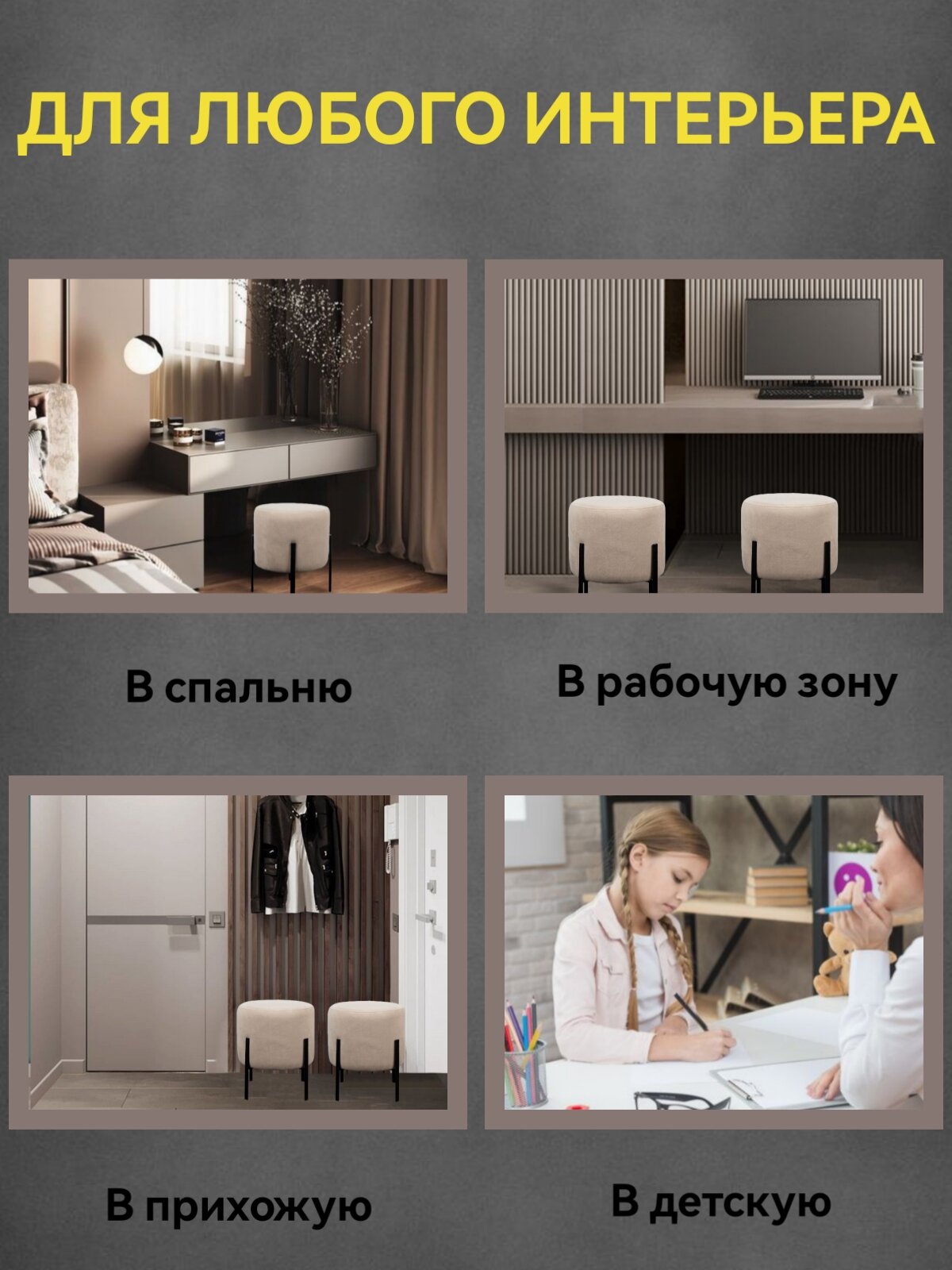 | Назначение | для гостиной / для детской / для кухни / для ног / для прихожей / для спальни |