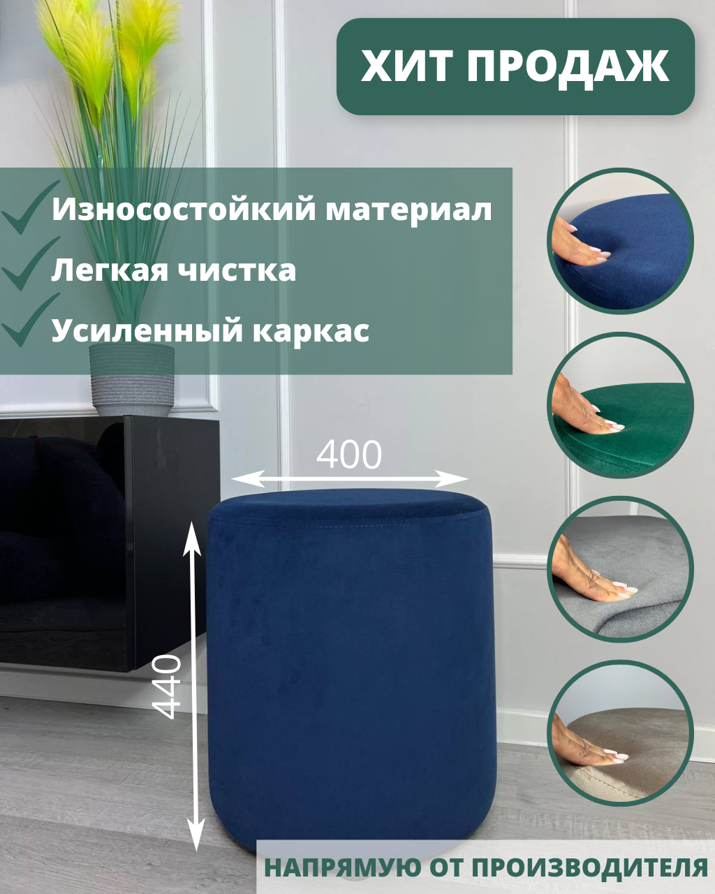 Пуф круглый Элика / пуфик в прихожую, в спальню / велюр / темно-синий