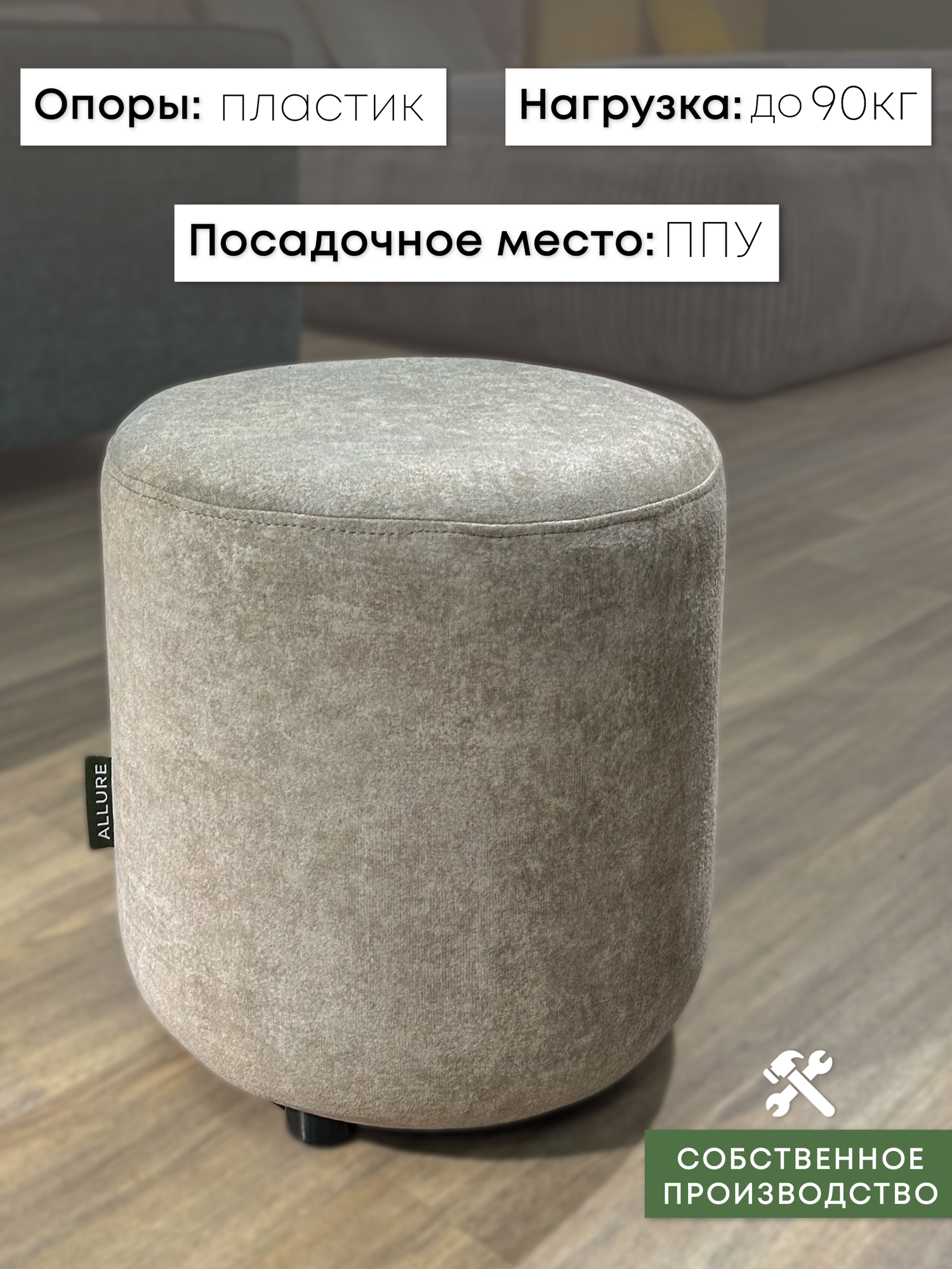 Пуф пуфик круглый для спальни и прихожей, ALLURE, 40x40x42 см, велюровый серый