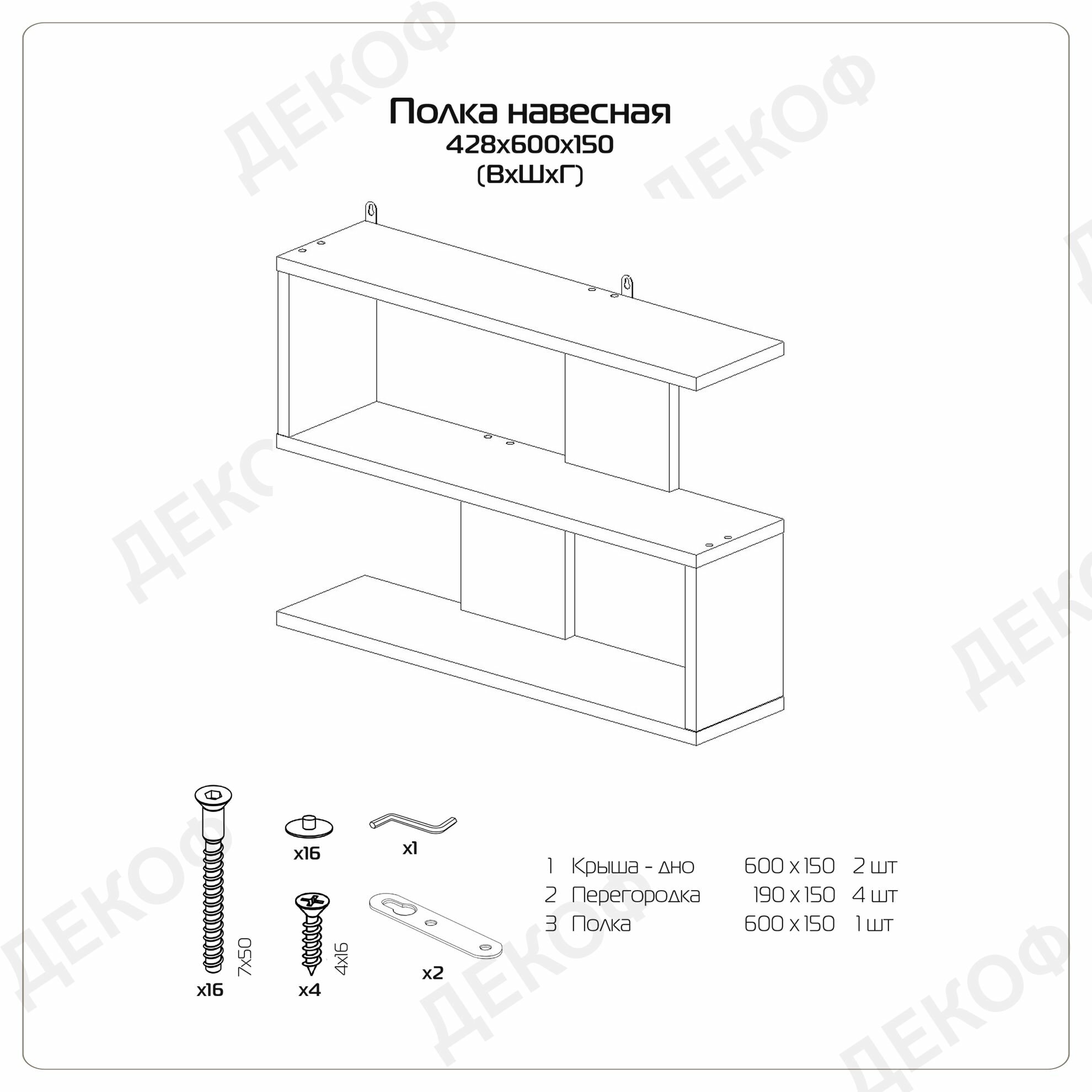 | Комплектация | Панель ЛДСП 800*250 2 шт. Панель ЛДСП 268*250 3 шт. Шестигранник - 1 шт Навесы - 2 шт Евровинты - 12 шт Заглушки - 12 шт Саморезы (16 мм) - 4 шт Дюбель - саморез - 2 шт |