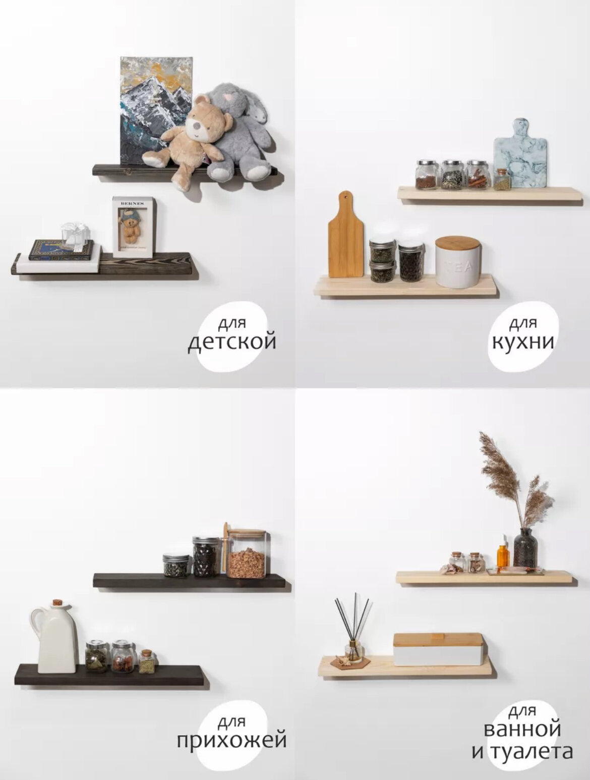 | Назначение | для ванной / для гостиной/спальни / для детской / для икон / для книг / для кухни / для прихожей / для роутера / для сауны/бани / для специй / для фоторамок и сувенирной продукции / универсальное |