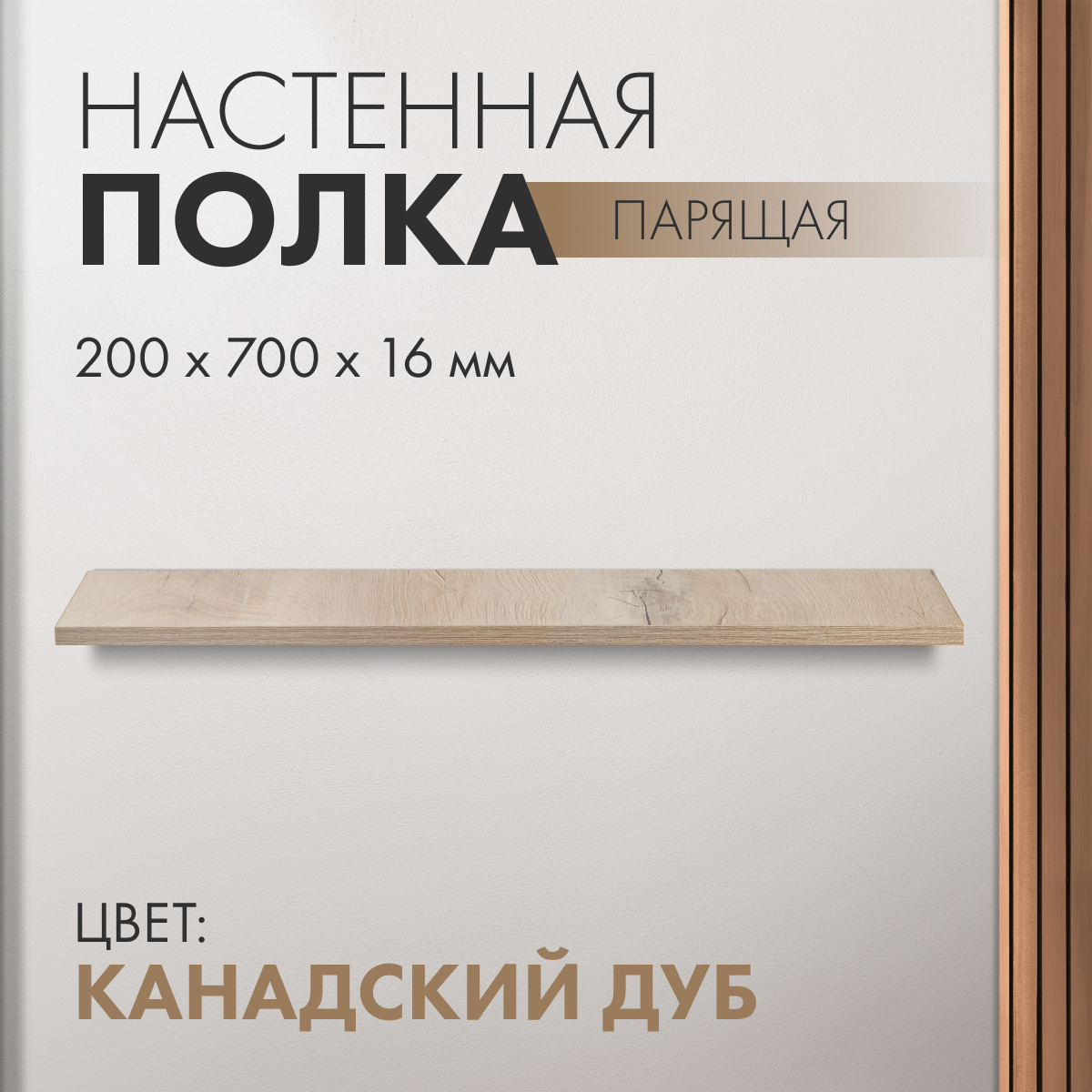 Настенная парящая полка 20х50х16см, ЛДСП, цвет канадский дуб
