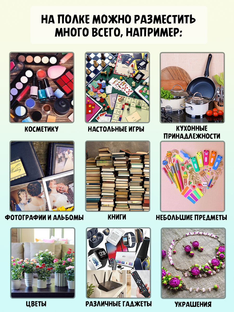 | Назначение | для ванной / для гостиной/спальни / для икон / для книг / для кухни / для прихожей / для роутера / для специй / для фоторамок и сувенирной продукции / универсальное |
