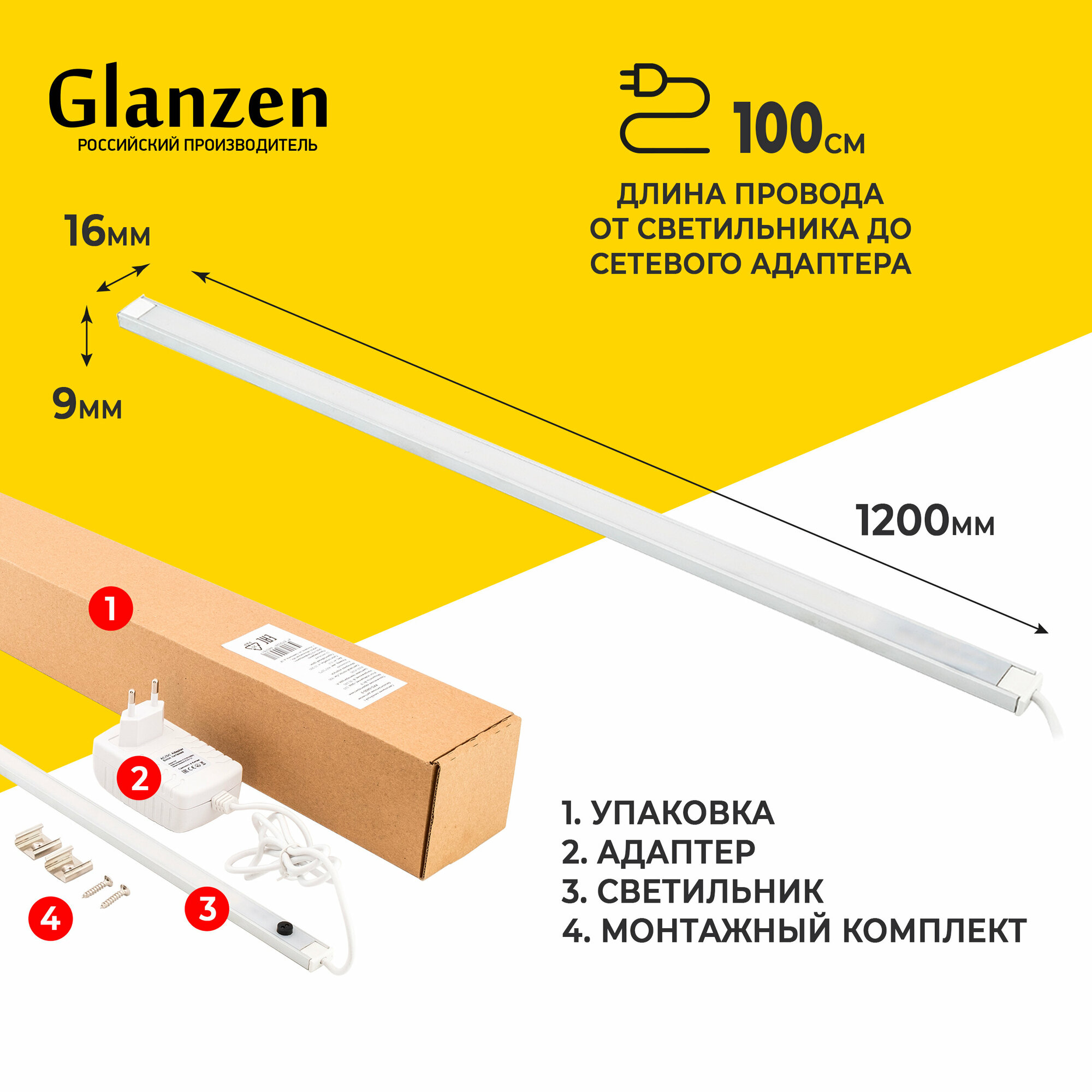 Купить Светильник линейный с бесконтактным управлением/диммируем лед подсветка 30 Вт 4000K 1200 мм GLANZEN RPD-1200-30 подсветка для кухни, в шкаф