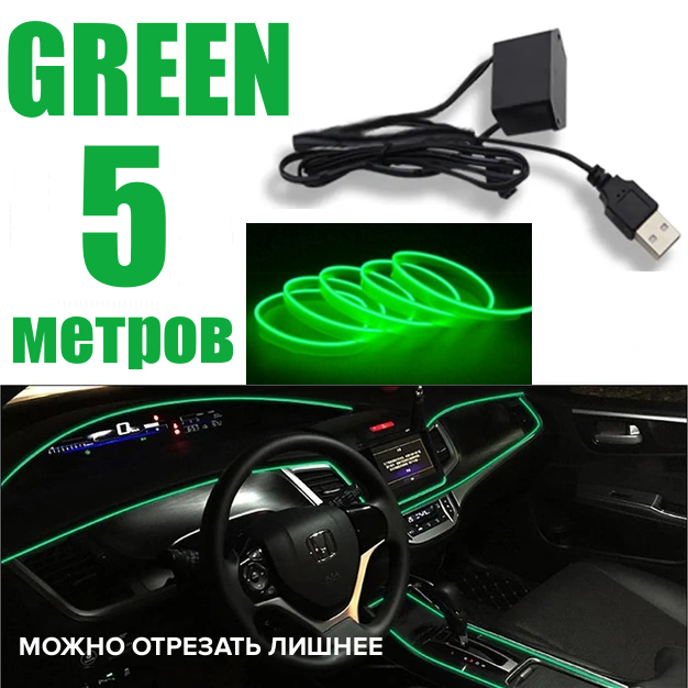 Купить Неоновая нить для подсветки салона авто, светодиодная лента в машину в салон, в USB 5 Вольт, 5 метров зеленый от прикуривателя 12В, атмосферная подсветка салона