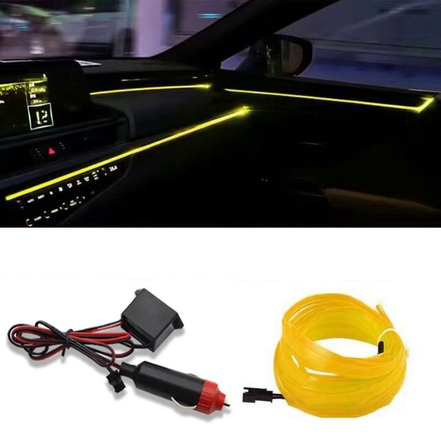 Купить Неоновая нить для подсветки салона авто, светодиодная лента в машину в салон, 5 метров желтый, от прикуривателя 12В, атмосферная подсветка салона, подсветка салона авто