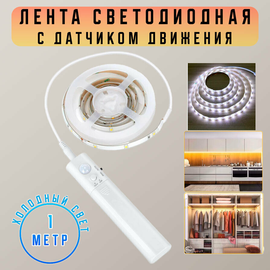 Светодиодная лента огонёк 1 метр, белый холодный свет, с датчиком движения, подсветка лестниц, шкафов-купе и т.д. интересное: