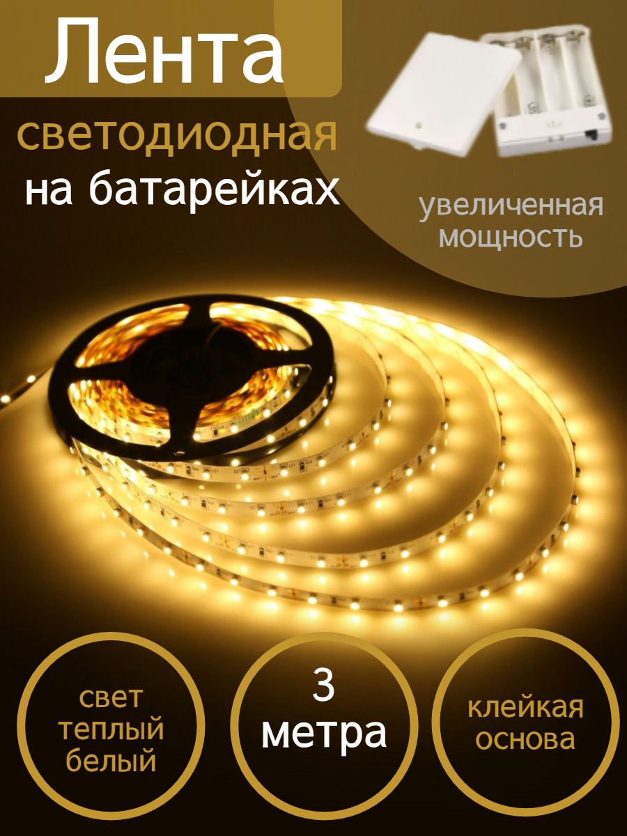 Купить Лента светодиодная на батарейках, 3 метра теплый белый/Rezlazer