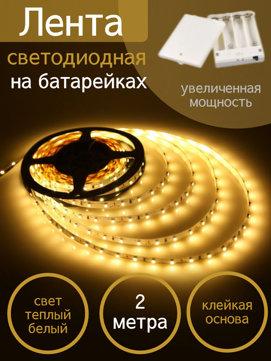 Купить Лента светодиодная на батарейках, 2 метра, теплый белый/Rezlazer