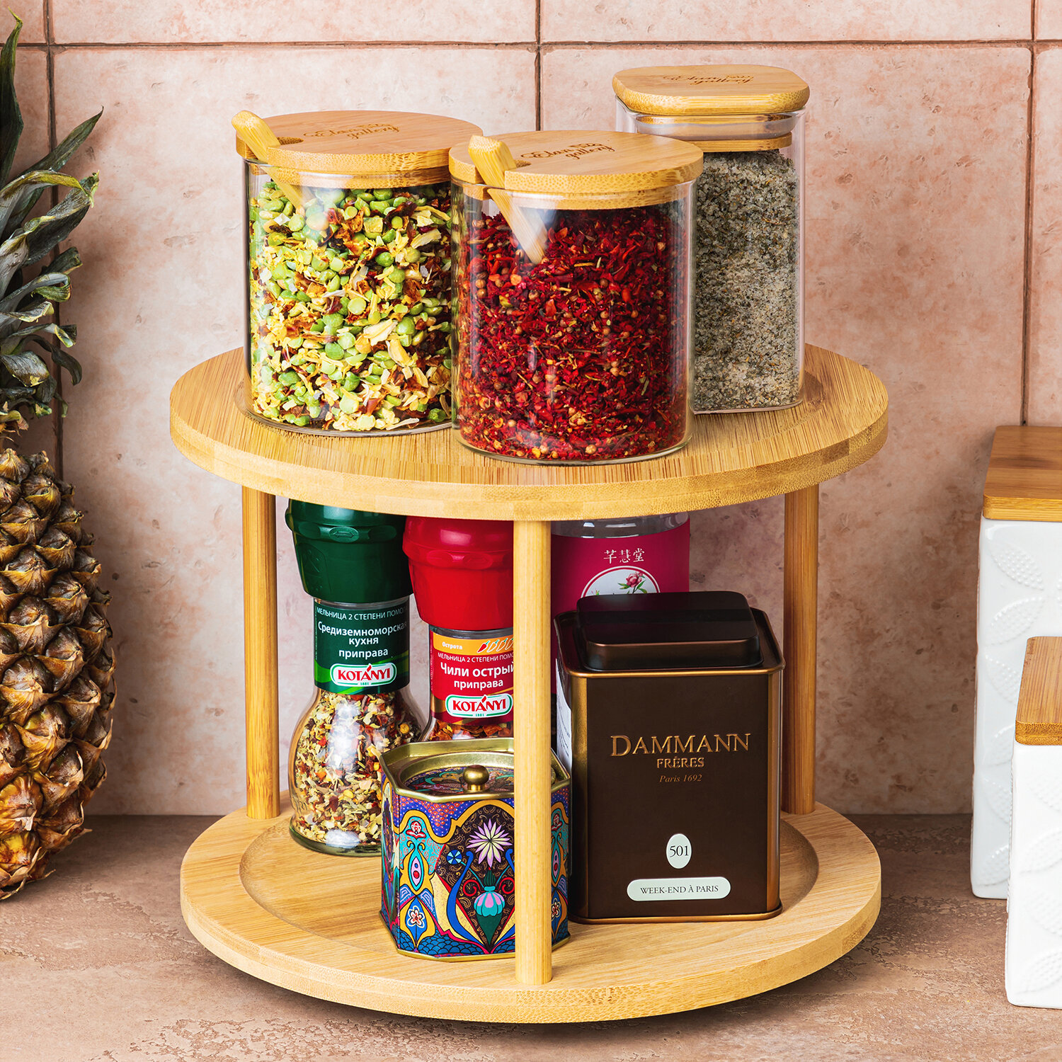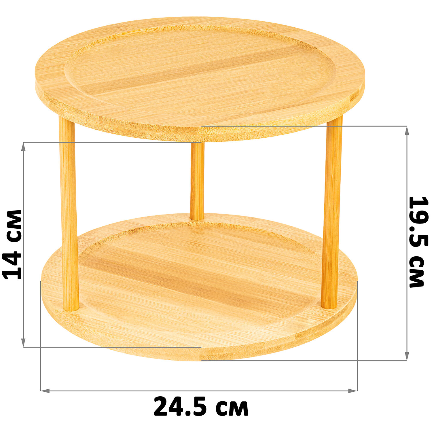 | Дополнительная информация | Подставка 2-уровневая 24,5*24,5*17,5 см, вращающаяся, расстояние между ярусами 16 см, многофункциональная, бамбук |