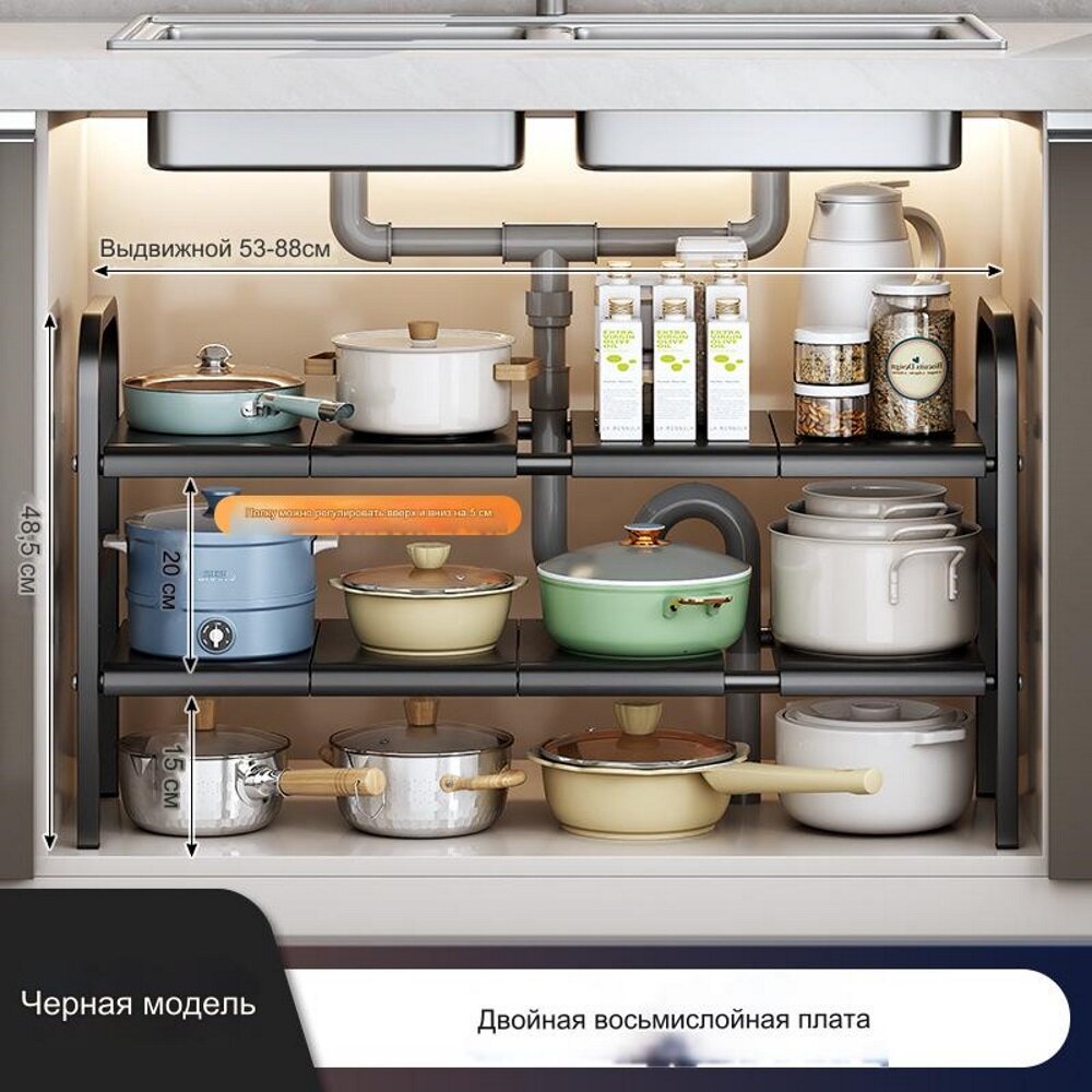 СохранитьОрганайзер под раковиной — выдвижная кухонная полка для хранения под раковиной двухъярусная 8 полок, черная интересное: