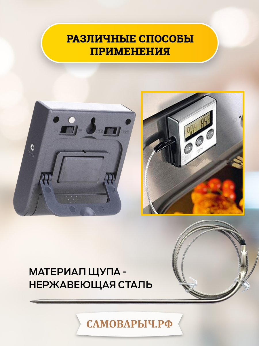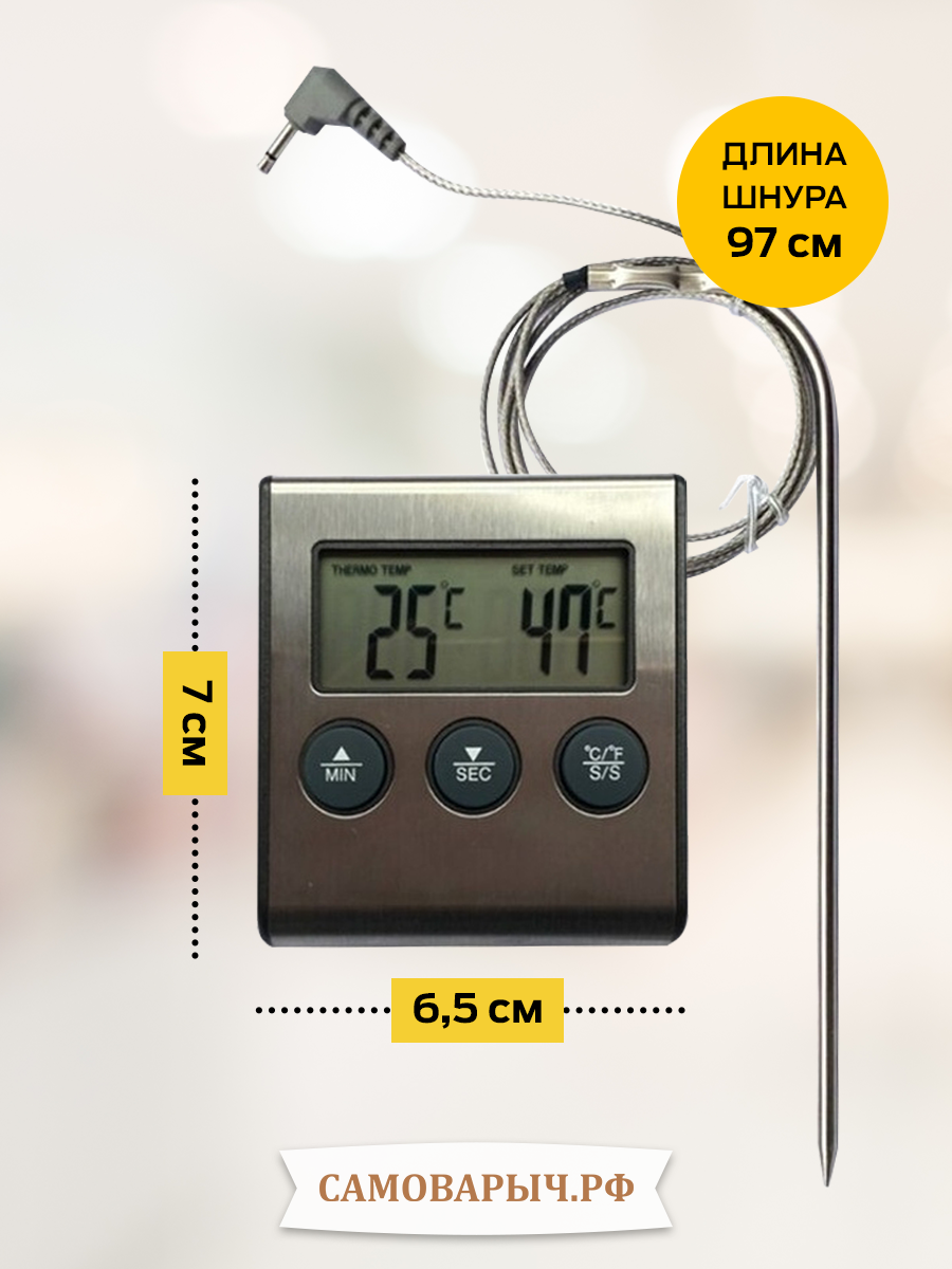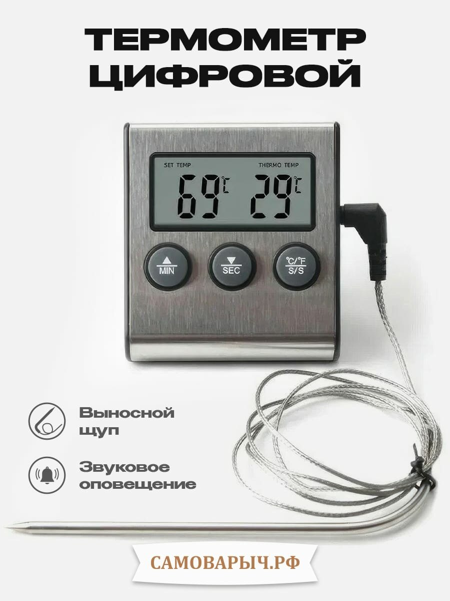 Кулинарный термометр электронный со щупом из нержавеющей стали, термометр для еды, мяса, вина, провод 1 метр / таймер кухонный