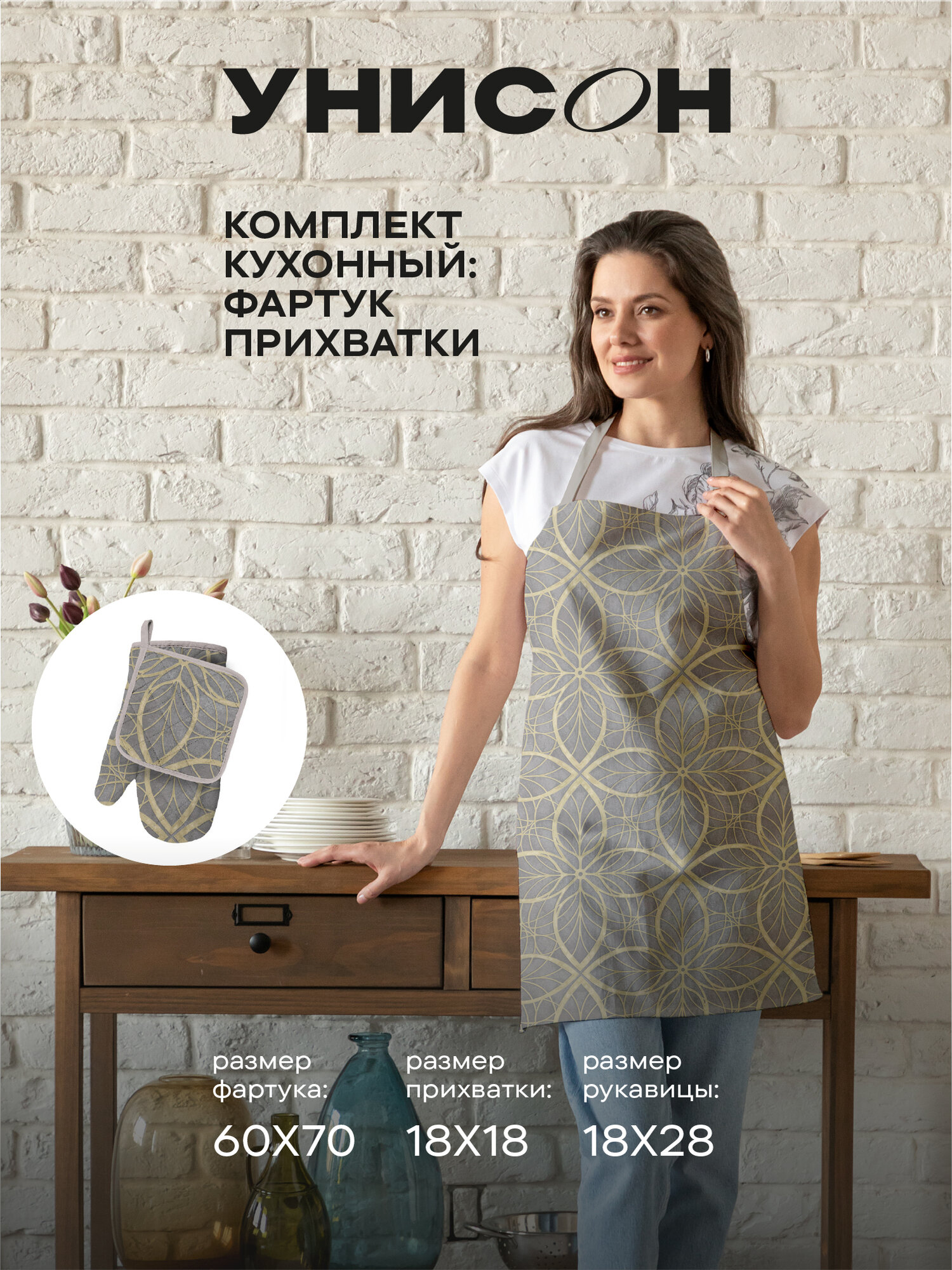 Комплект кухонный рогожка (прихватка 18х18, прихватка-рукавица 18х28, фартук 60х70) "Унисон" рис 33162-3 Nord