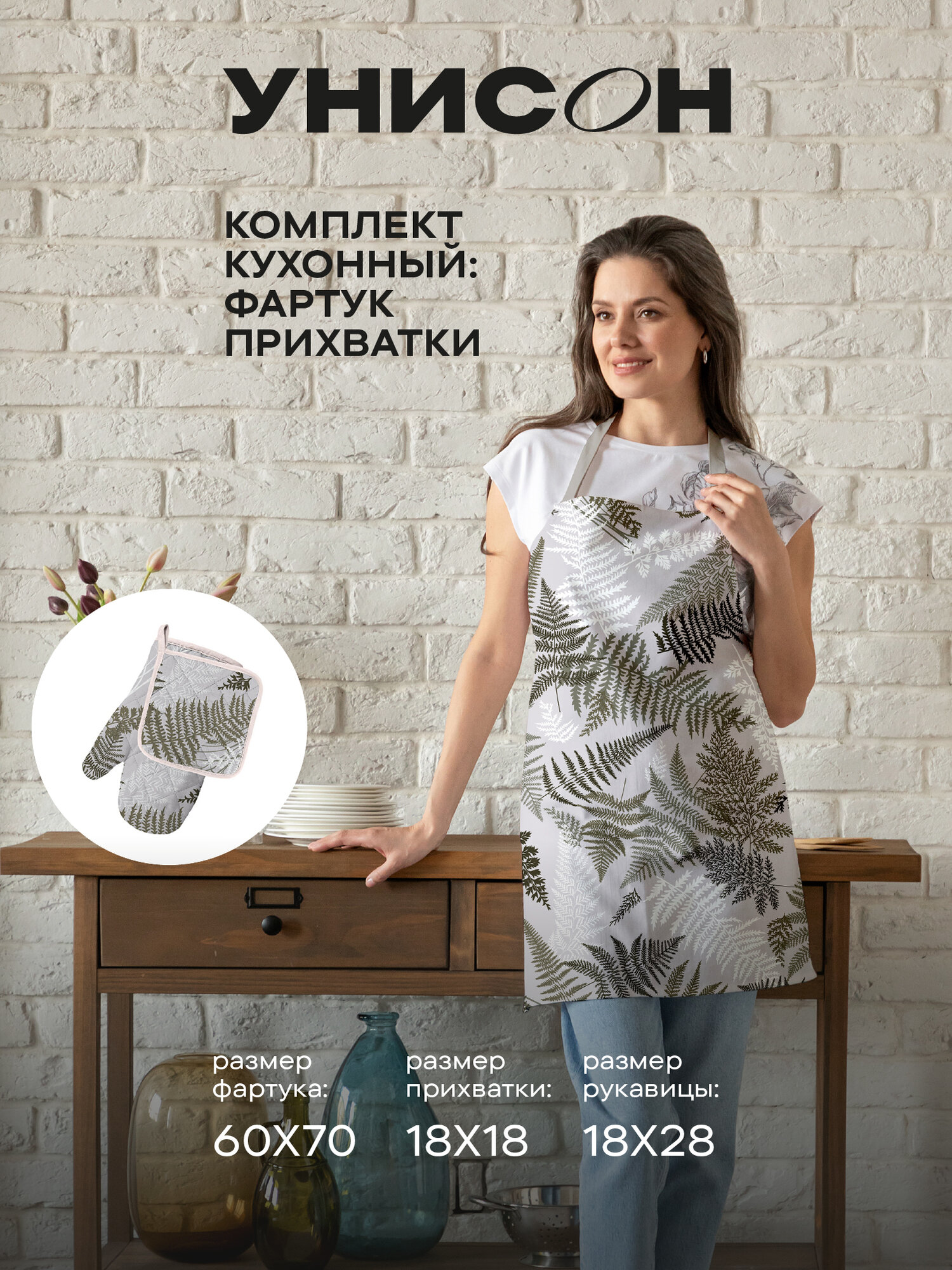 Купить Набор кухонных принадлежностей (прихватка для кухни 18х18, прихватка-рукавица 18х28, фартук кухонный женский - 60х70) "Унисон" рис 33159-4 Fern