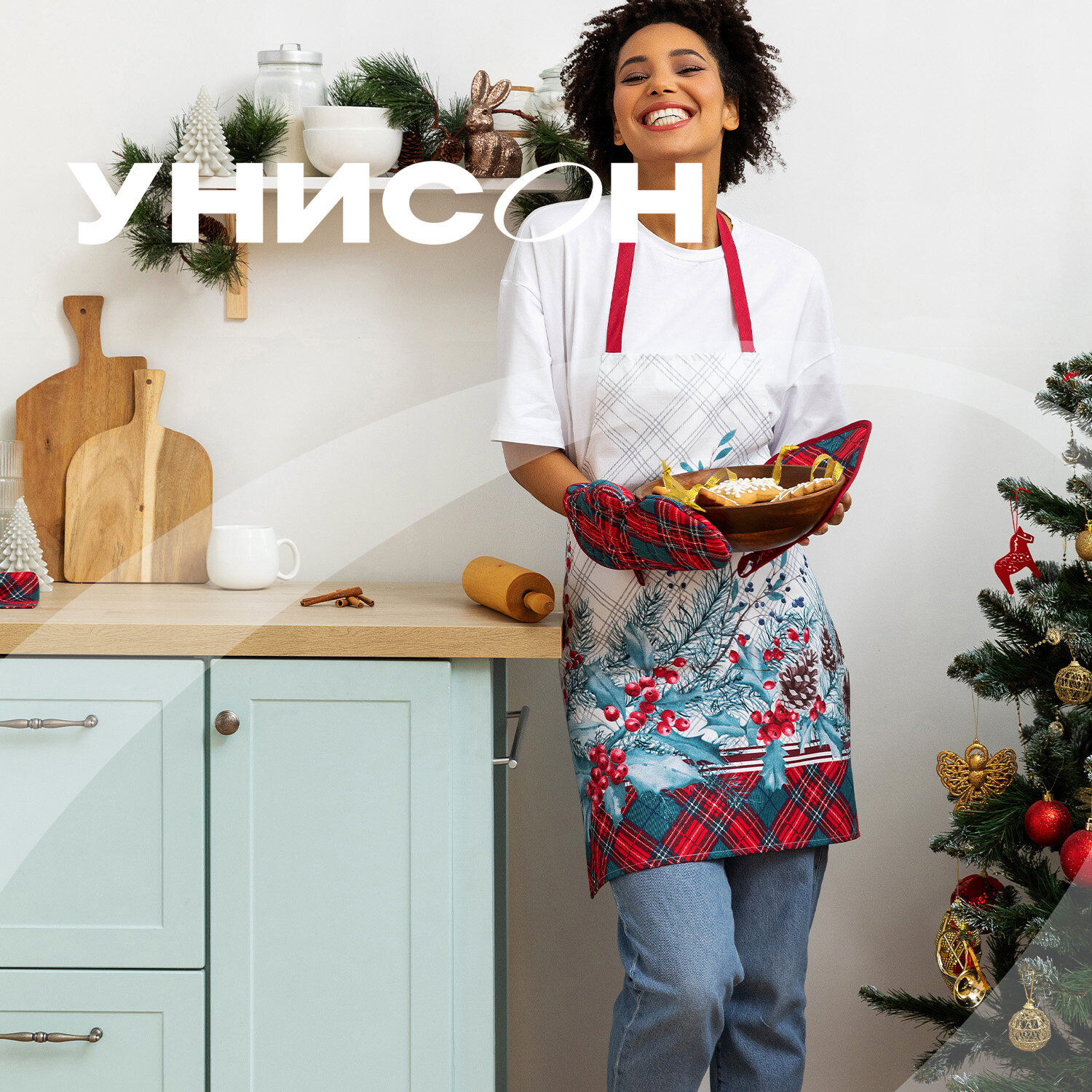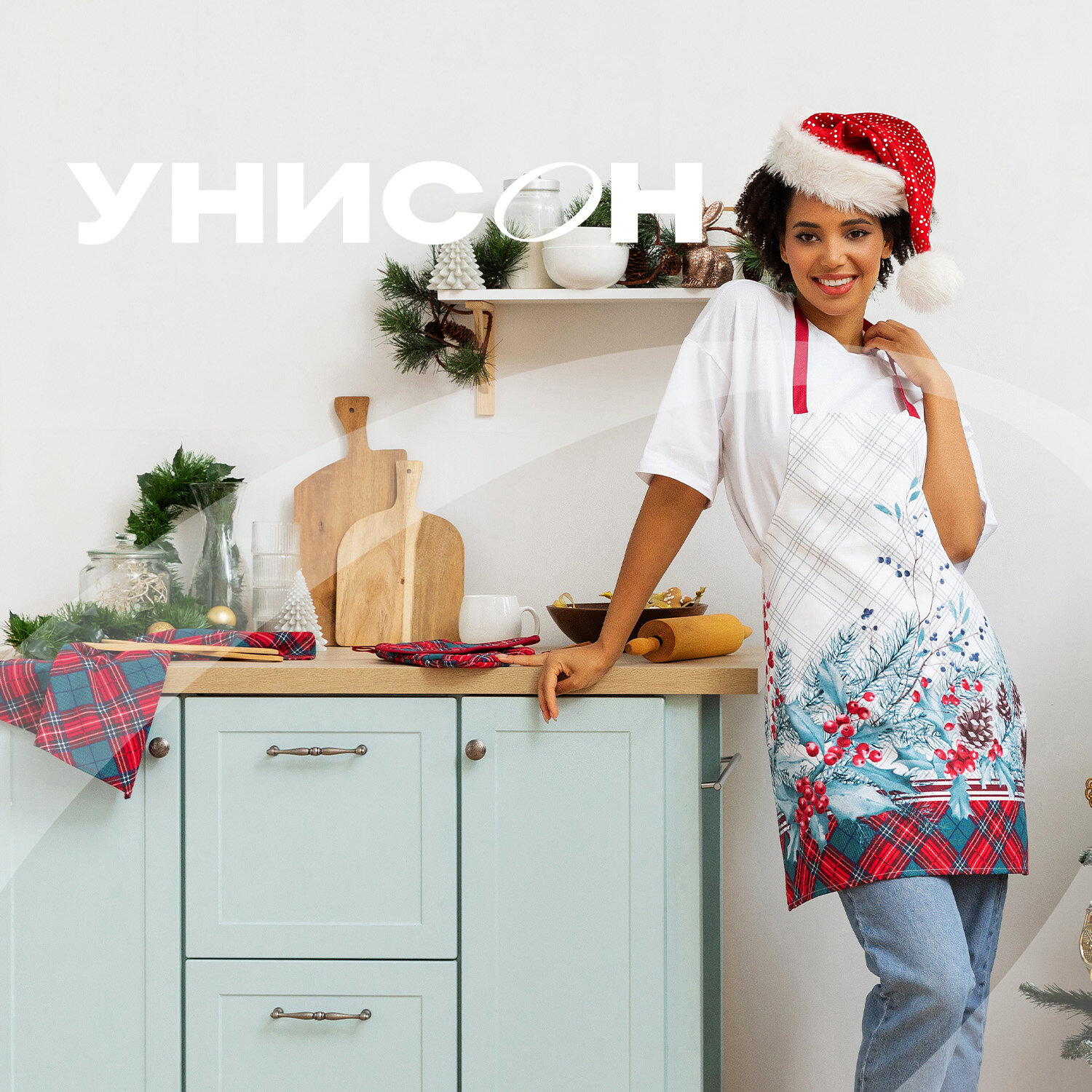 Комплект кухонный рогожка (прихватка 18х18, прихватка-рукавица 18х28, фартук 60х70) "Унисон" рис 33162-3 Nord