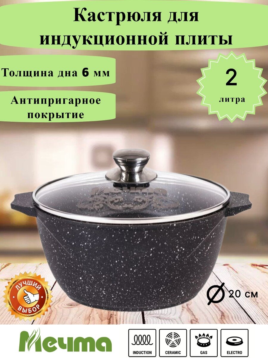 Купить Кастрюля индукционная с антипригарным покрытием 2 л Мечта Гранит Black, со стеклянной крышкой