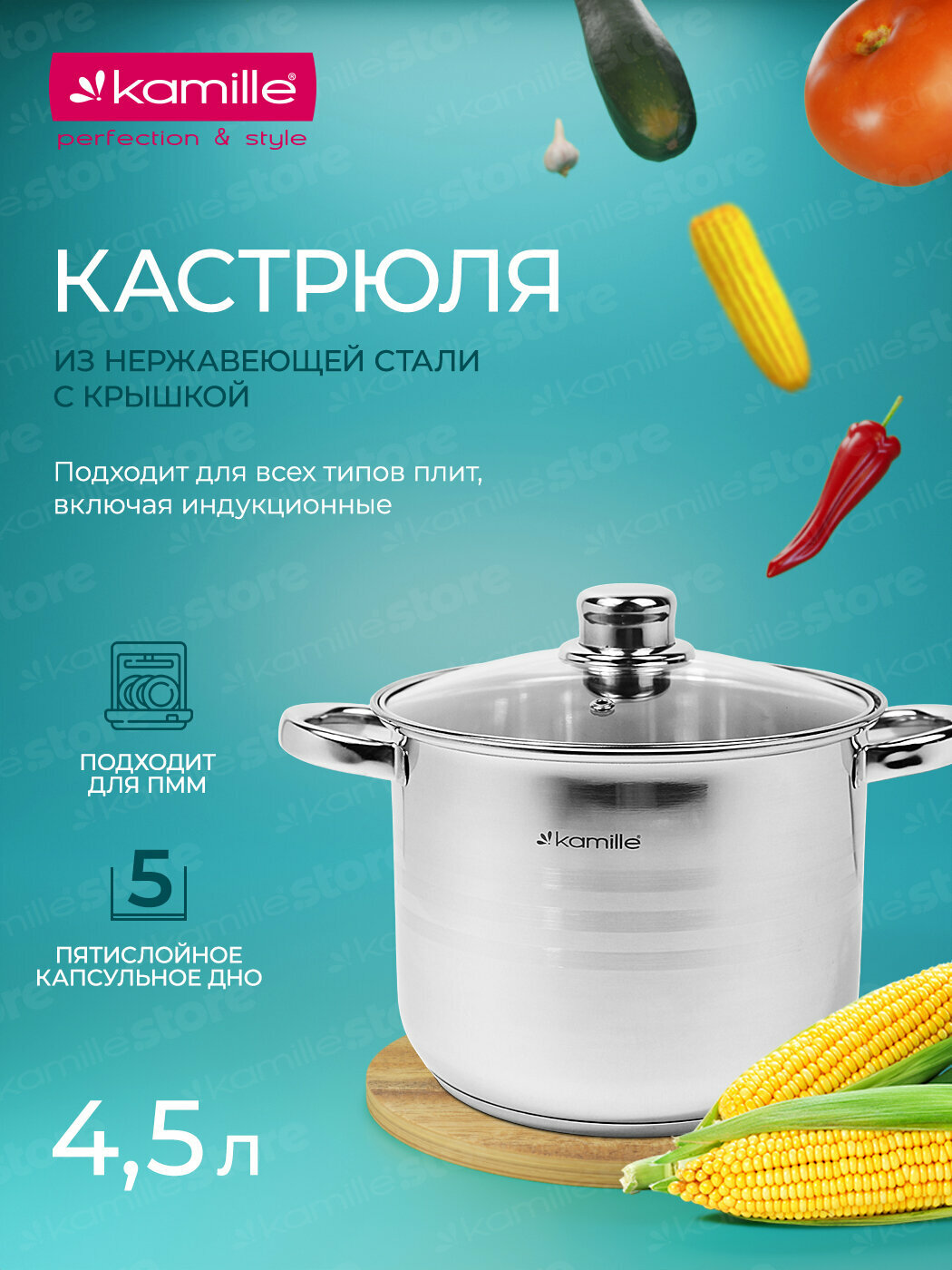 Кастрюля 4,5 л. из нержавеющей стали Kamille KM 5401 со стеклянной крышкой (4,5 л. / серебристый)