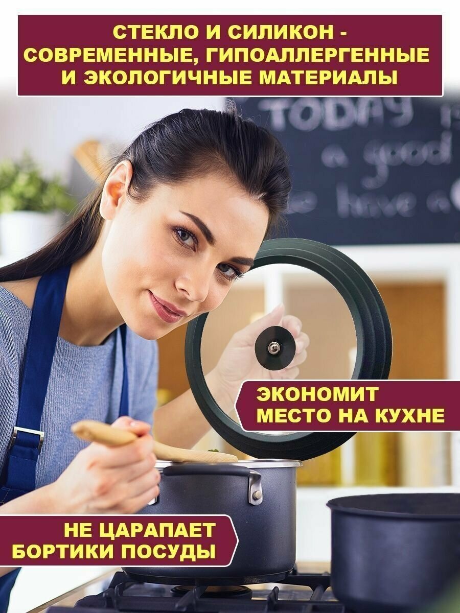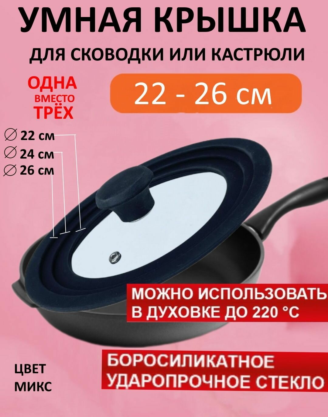 Умная крышка 3 в 1 черная 22 / 24 / 26 см, для кастрюли и сковородок, стеклянная крышка для посуды, крышка стекло и силикон интересное: