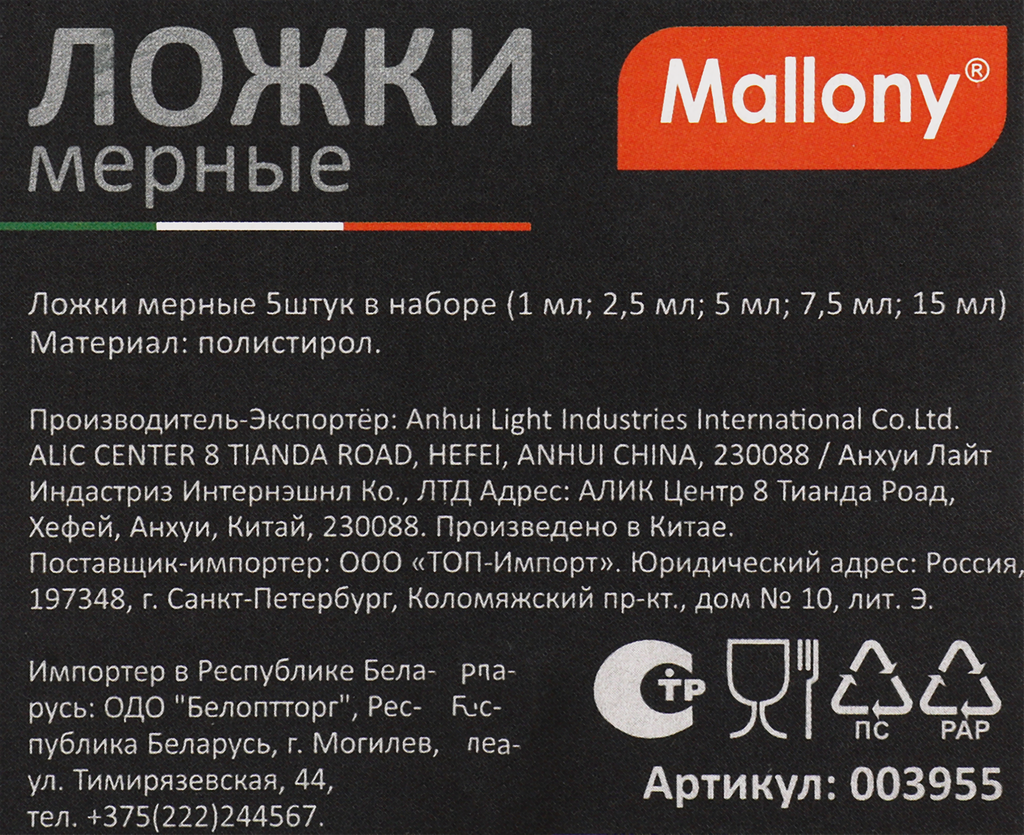 Ниже Вы можете прочитать отзывы на Ложки мерные, набор 5шт/уп, цена за уп, 1мл, 2,5мл, 5мл, 7,5мл, 15мл 3955 Mallony, ознакомится с подробными характеристиками, посмотреть интересные обзоры и фотографии на Ложки мерные, набор 5шт/уп, цена за уп, 1мл, 2,5мл, 5мл, 7,5мл, 15мл 3955 Mallony.