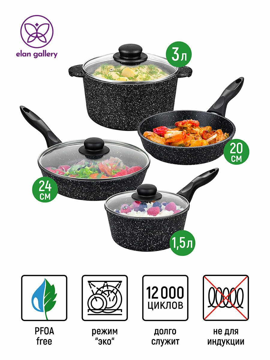 Набор 4 пр. Elan Gallery гармония вкуса Черный мрамор Кастрюля 3 л, ковш 1,5 л, сковороды 24 см, 20 см