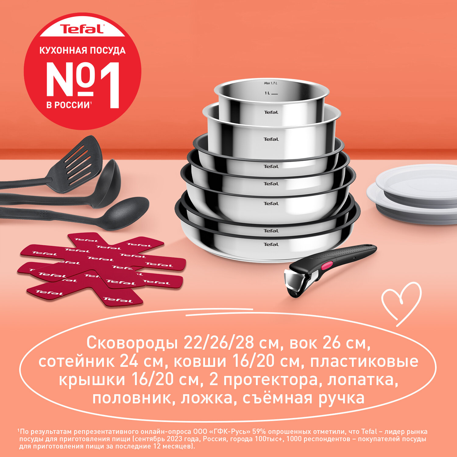 Набор посуды со съемной ручкой Tefal Ingenio Cook Eat L881S904, 9 предметов, нержавеющая сталь