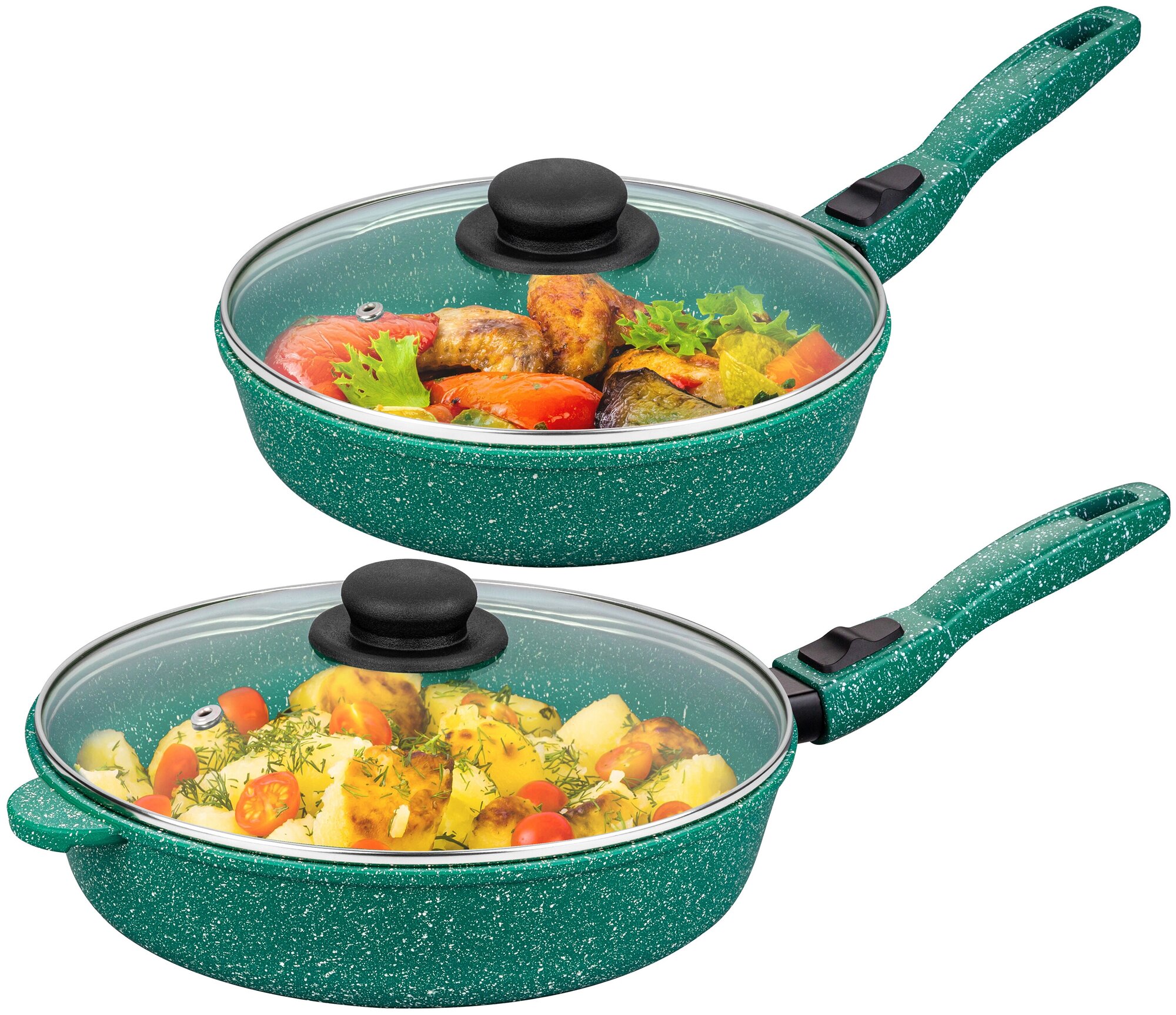 Набор 4 предмета - Сковорода глубокая 24 см, 28 см с крышками гармония вкуса Изумруд, со съёмными ручками интересное: