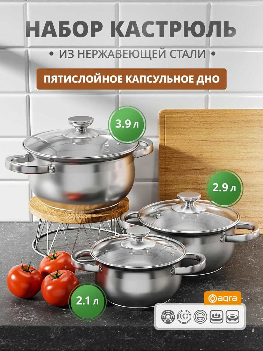 Набор кастрюль из нержавеющей стали AQRA 6 предметов, для всех видов плит, комплект кастрюль с крышками (2,1л, 2,9л, 3,9л) интересное: