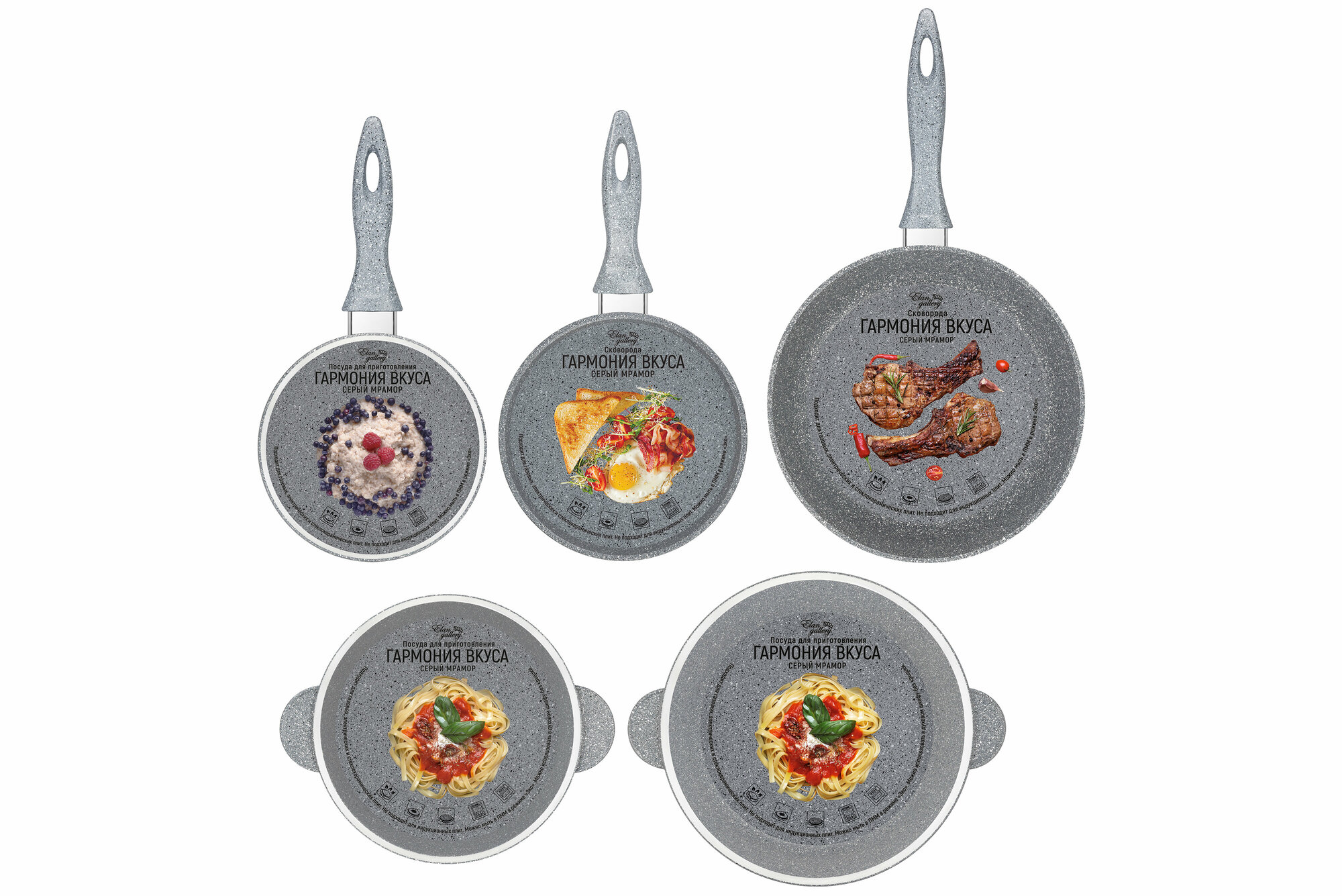Купить Набор 8 пр. Elan Gallery гармония вкуса Серый мрамор Сковороды глубокие 18см,26см с н/с ручками, Жаровня-сотейник 26см, Кастрюля 3л, Ковш 1,2 л+3кр.