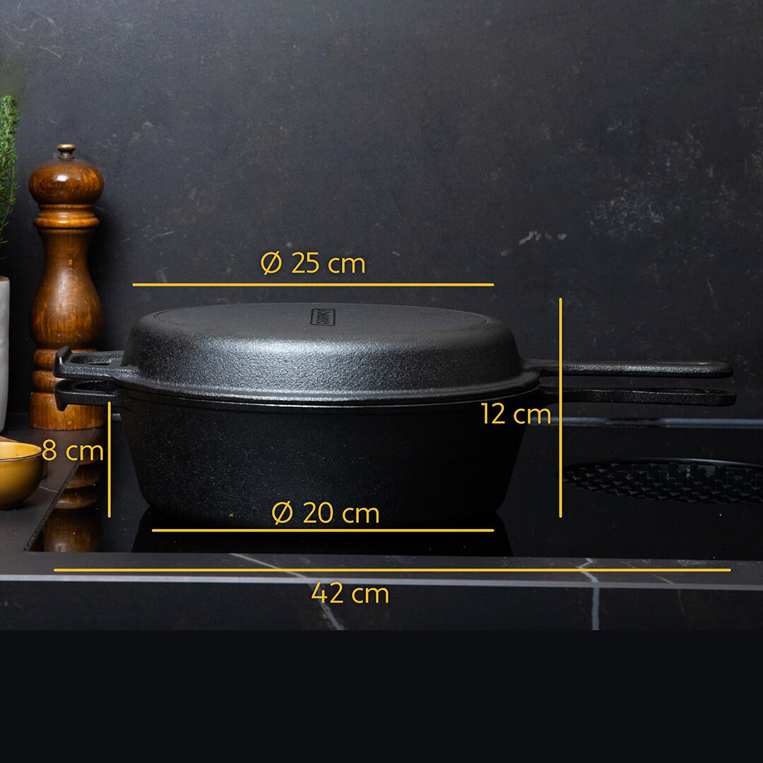 | Дополнительная информация | диаметр 25 см; плоское дно; равномерный нагрев; высокая теплоемкость; жаропрочная; термостойкость до 250°C; многослойное дно; 2 ручки; совместимость: газовые плиты, индукционные плиты, электрические плиты, стеклокерамические плиты, духовка, открытый огонь, галогеновые конфорки |