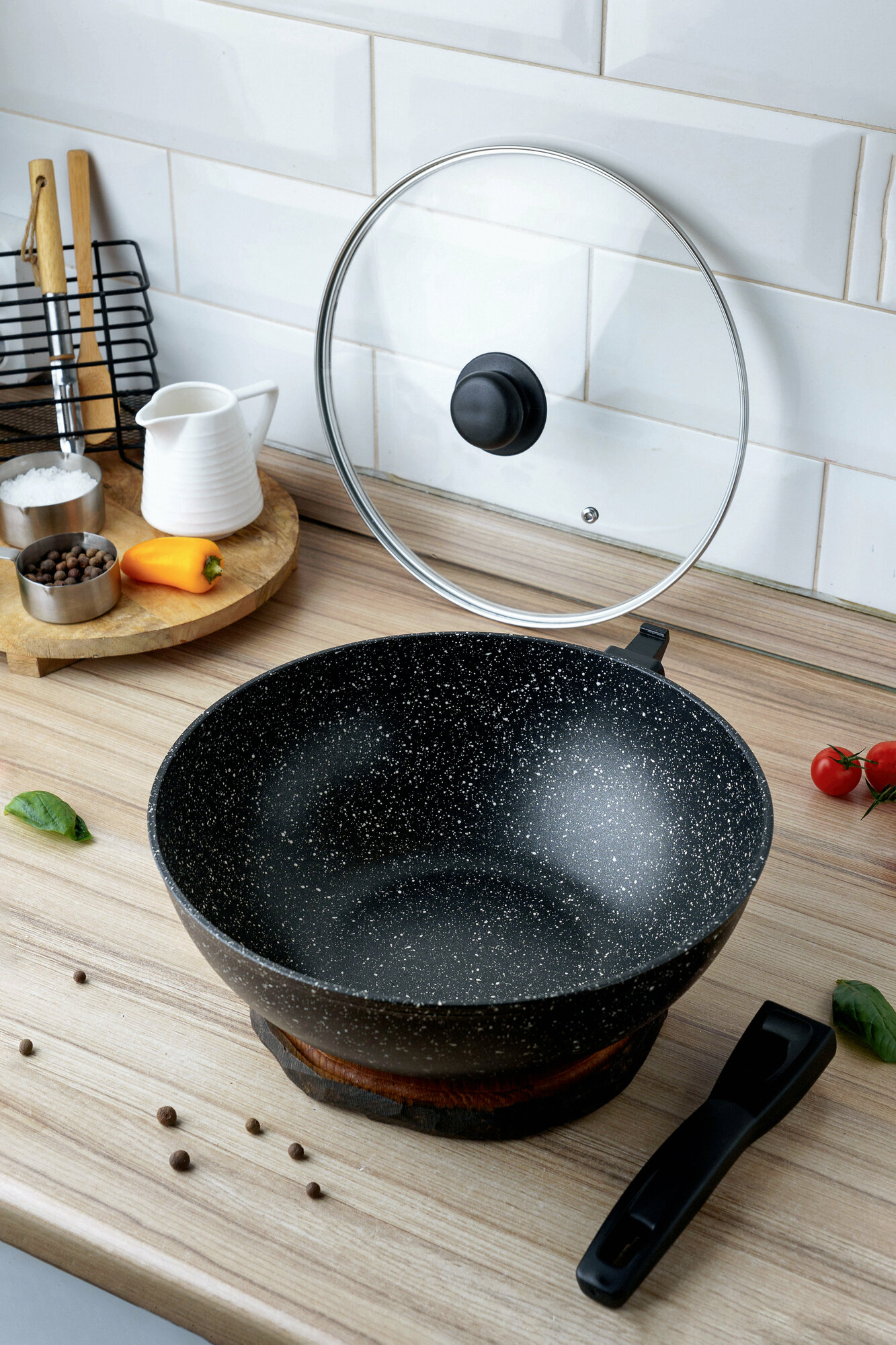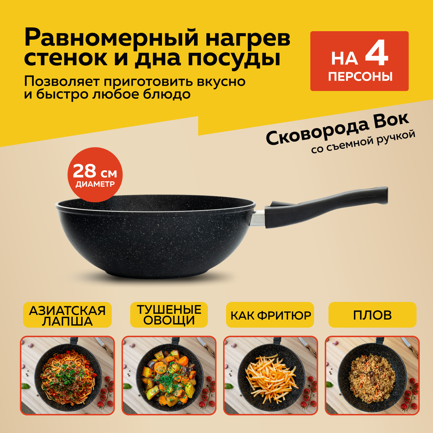 | Комплектация | сковорода-вок - 1 шт, стеклянная крышка - 1 шт, съемная бакелитовая ручка - 1 шт |