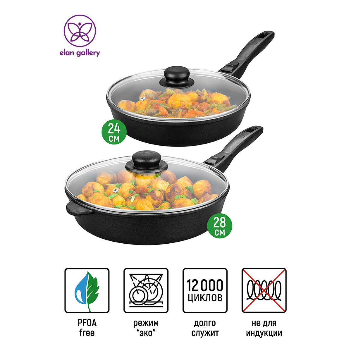 Набор 4 предмета - Сковорода глубокая 24 см, 28 см с крышками Elan Gallery гармония вкуса Черный Оникс, со съёмными ручками интересное: