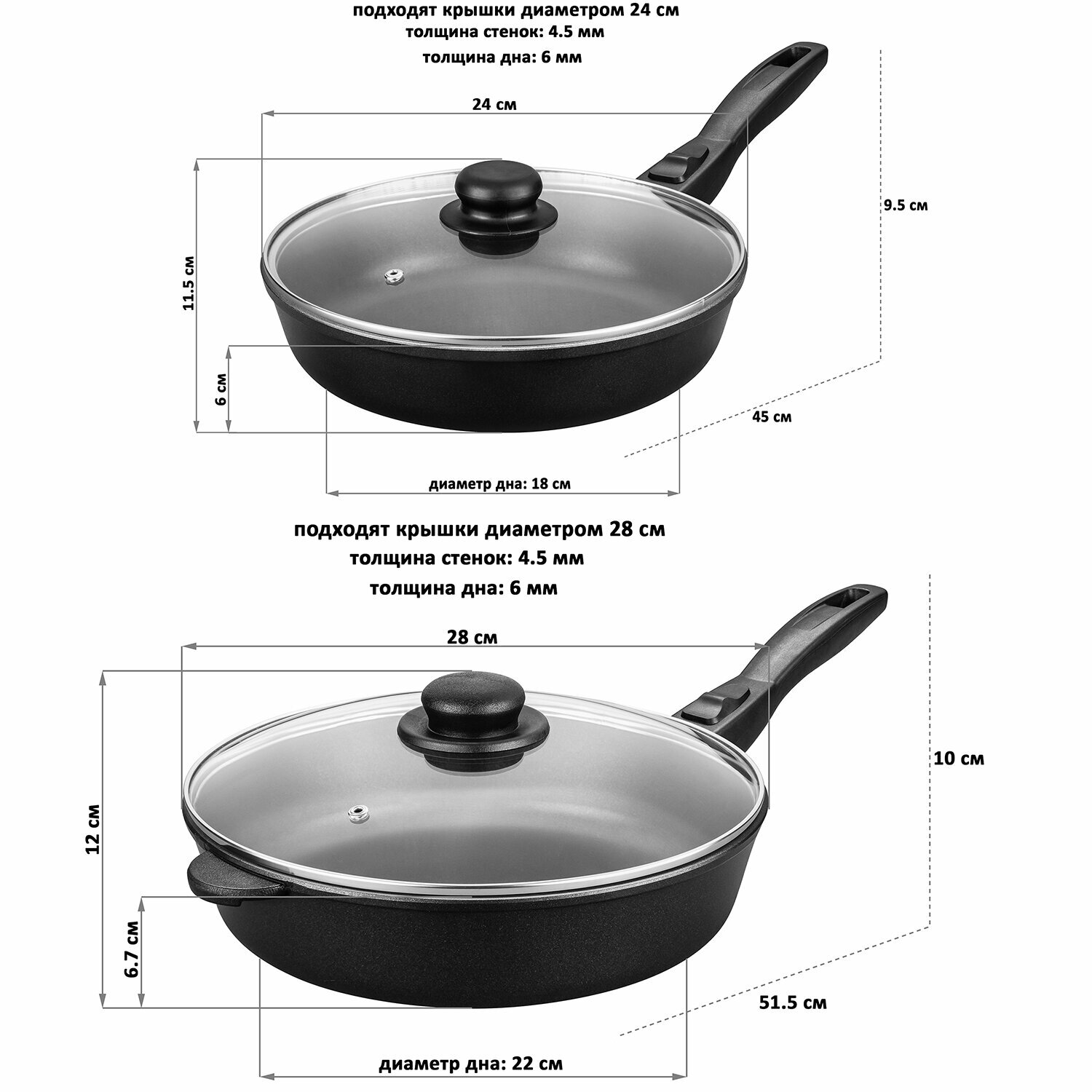 | Комплектация | сковорода 2 шт., стеклянная крышка 2 шт., съемная бакелитовая ручка 2 шт. |